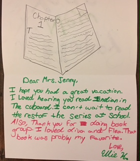 Thursdays I read aloud at the library. I chapter read, and that is far different than reading a story. Each Thursday ends with and then? For thirty minutes children are glued to every word, because those words are powerful and exciting, and heart pounding. The words are complicated and make children think. We sit together, close. When I read aloud I yell, whisper, cry, gasp…whatever those words on the page are saying. They push every button and pull every string, and I read it just that way.