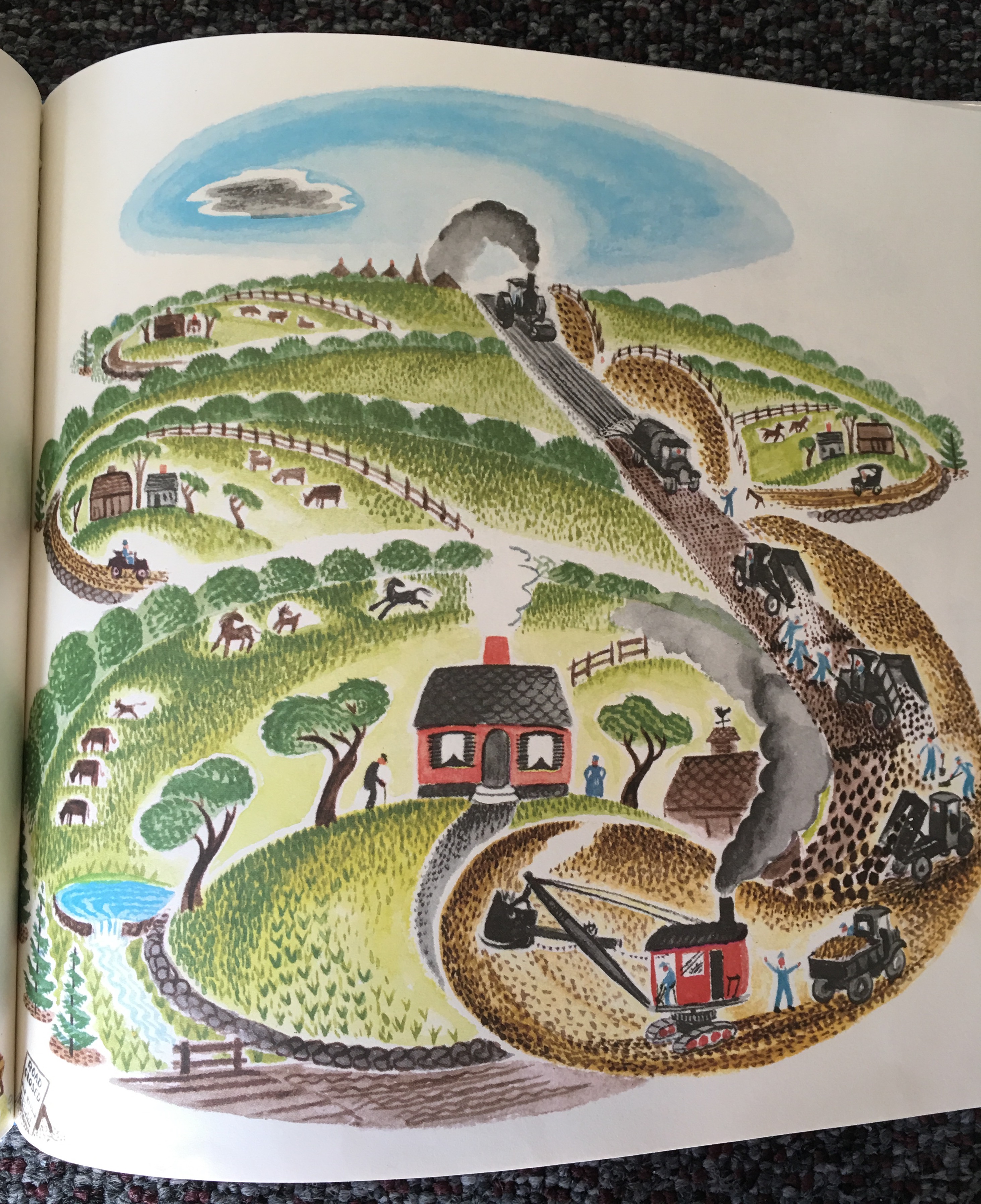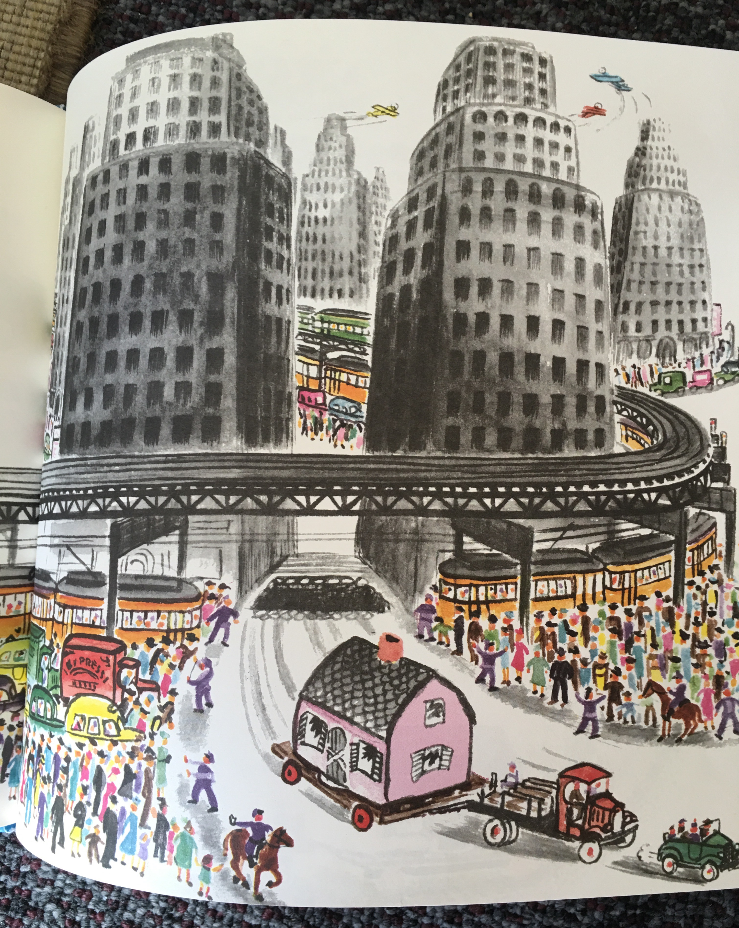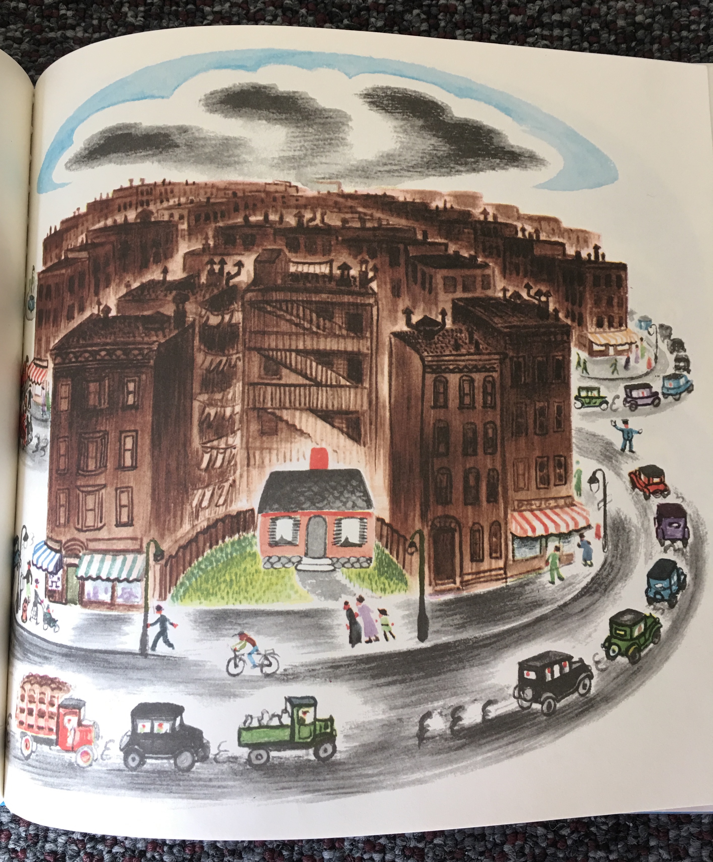 As I read one of the classic children’s books, The Little House by Virginia Lee Burton, it turned out to be an unexpected history lesson.  This wonderful book begins with a charming little house on a hill, living through days and nights and the seasons.  She loves the countryside and the changes.  The early illustrations capture all the images of the seasons.  At this point in the book children are hooked, because they love the little house.  As I turned the pages they knew summer followed spring, then autumn then winter.  Each page was predictable.
