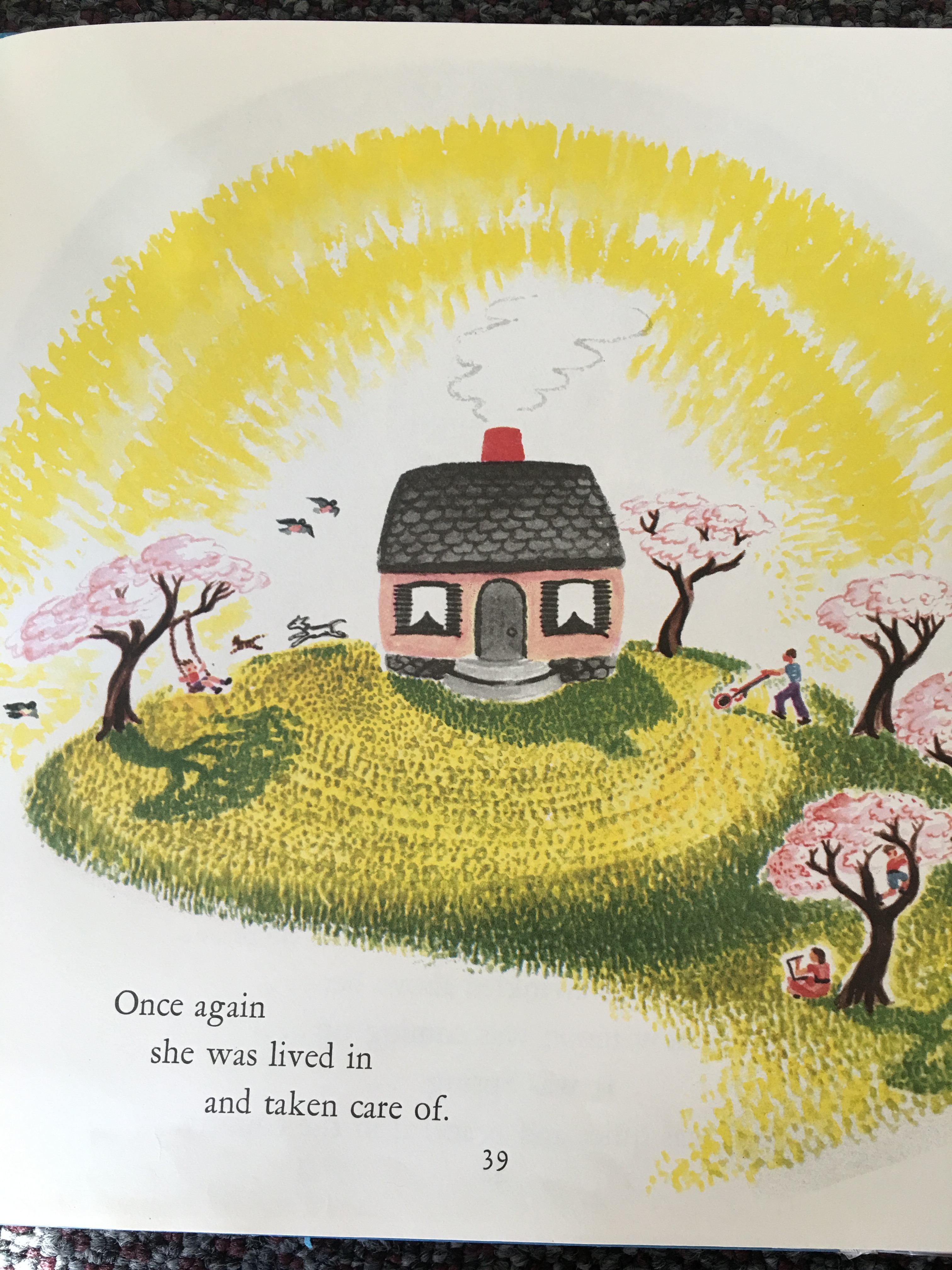 Of course we never forgot about the little house, especially when she was moved from the city back to the country.  This was perhaps the most exciting page; it sparked great conversation.  Children asked how they did that, moving the house, and also asked how deep the hole was, and if the house was okay.  This is the pinnacle in education.  This page is all about math, science, engineering, kindness, history, and language.  I think that’s why children like this page.  There is so much to talk about and so much to learn.