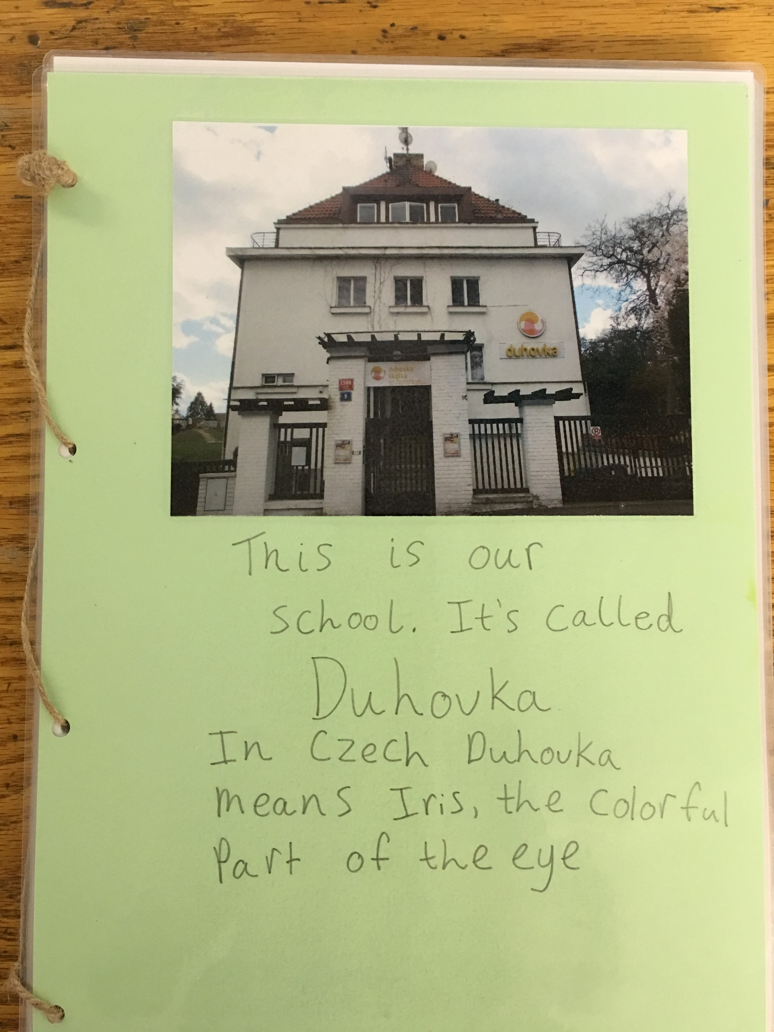 A Pen-Pal is an exciting way to learn about other people and countries, because it is hands-on.  No computers, no iPads, just real things that children can touch and see; letters, pictures, and even a book.  There is no instant gratification; instead there is the anticipation of what will come.  And come, it did.  This is a Montessori preschool in Prague, Czech Republic.  The handwritten words on the cover are beautiful, but the story is even better.