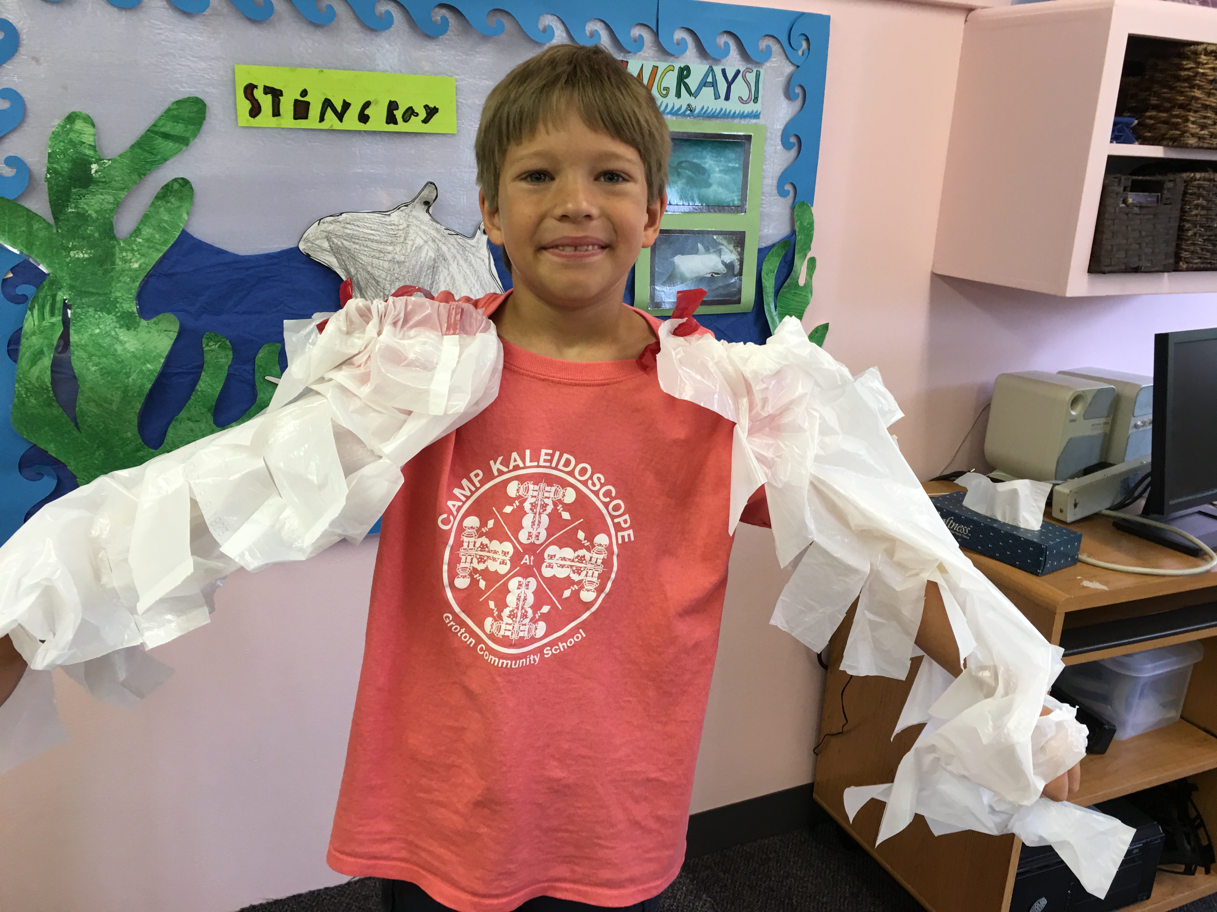Timothy planned his own costume.  He wanted to be a seagull, and he thought a white plastic trash bag cut along the sides would be perfect.  It was.  This made Timothy soar in his performance; not only as a seagull, but as an empowered child.  His costume was far better than anything I could have given him.