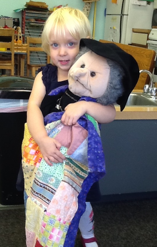 Thank you, Robin. Yes, it was Gloria who helped children design the quilt. It now hangs at the National Liberty Museum in historic Philadelphia, across the street from Carpenter’s Hall. The photo of the quilt is what I use on my blog. She showed children her own blankie, told them it made her feel peaceful and it was actually a peace quilt, not a blankie. The children loved that! They came up with their own ideas on what made them feel peaceful; that turned into a book, and then into the quilt. Emergent curriculum, building upon the interests of the children. Now, this whole evolution took a year. Gloria got the ball rolling. Puppets and stuffed animals are truly the best tools for helping children grow. Those with a personality are my favorites as well. I love that yours took them home, too!
