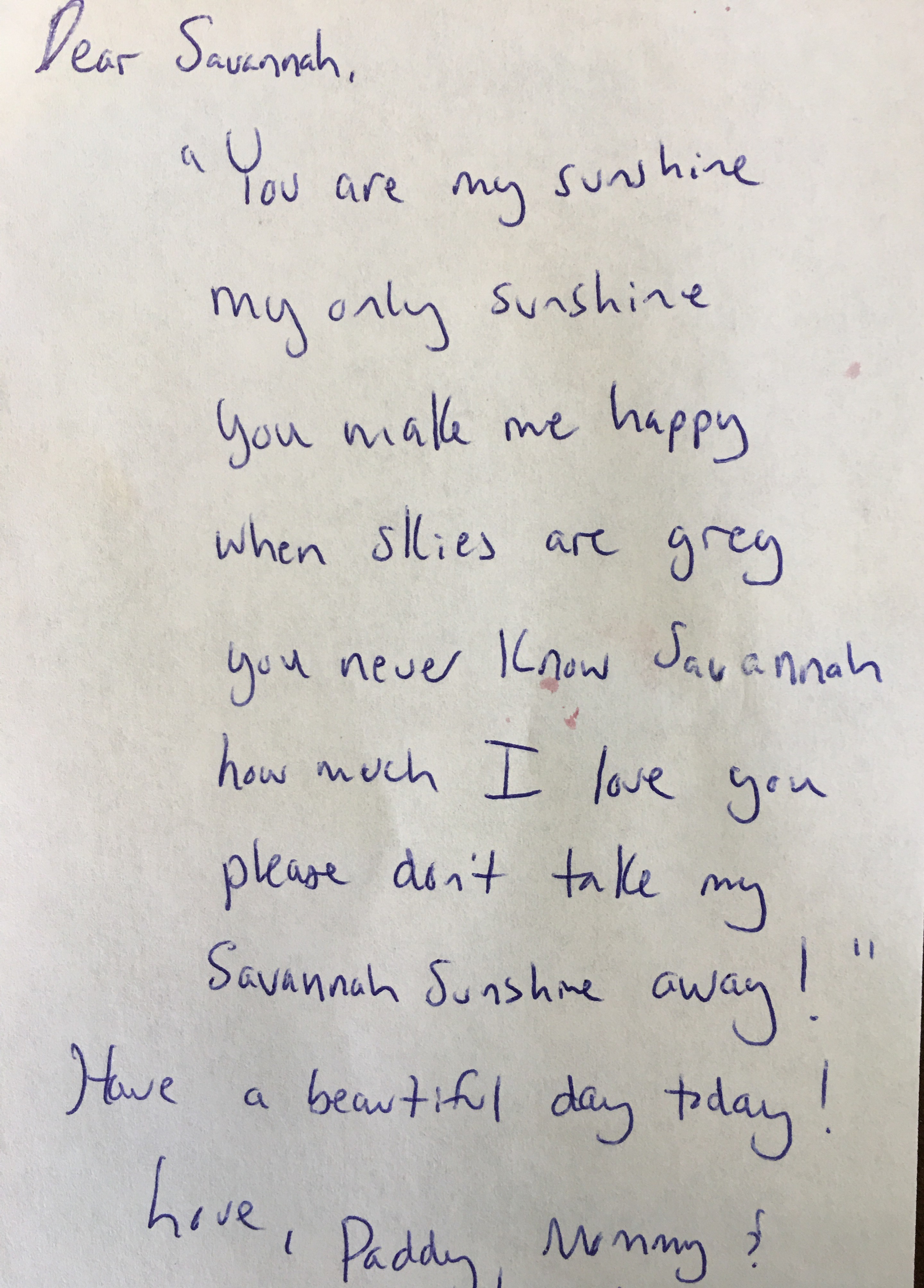 Savannah’s lunchbox often includes a note, full of loving words from Mom and Dad. When I pulled out this note, I just had to sing it. The note was meant for a song. Yes, I sang it to Savannah (and everybody else) in a big voice with my hands on my heart and my arms all over the place.