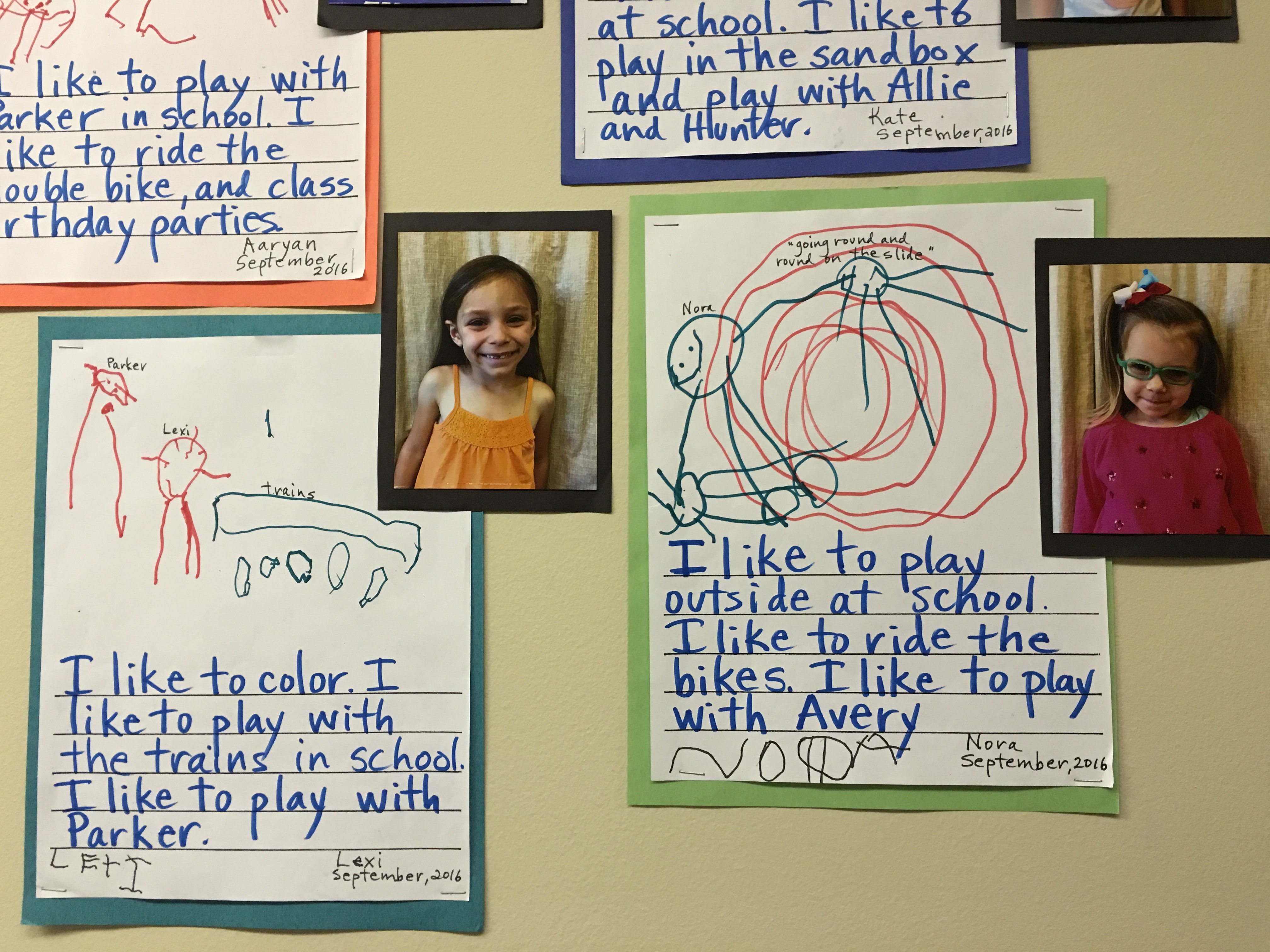 Imagine being three or four years old and asked by your teacher what you like to do in school.  And then, your teacher carefully writes every word that you say.  That tells a child that words are important.  The ‘frosting on the cake’ to validate a child’s words is asking the child to illustrate what s/he has said.