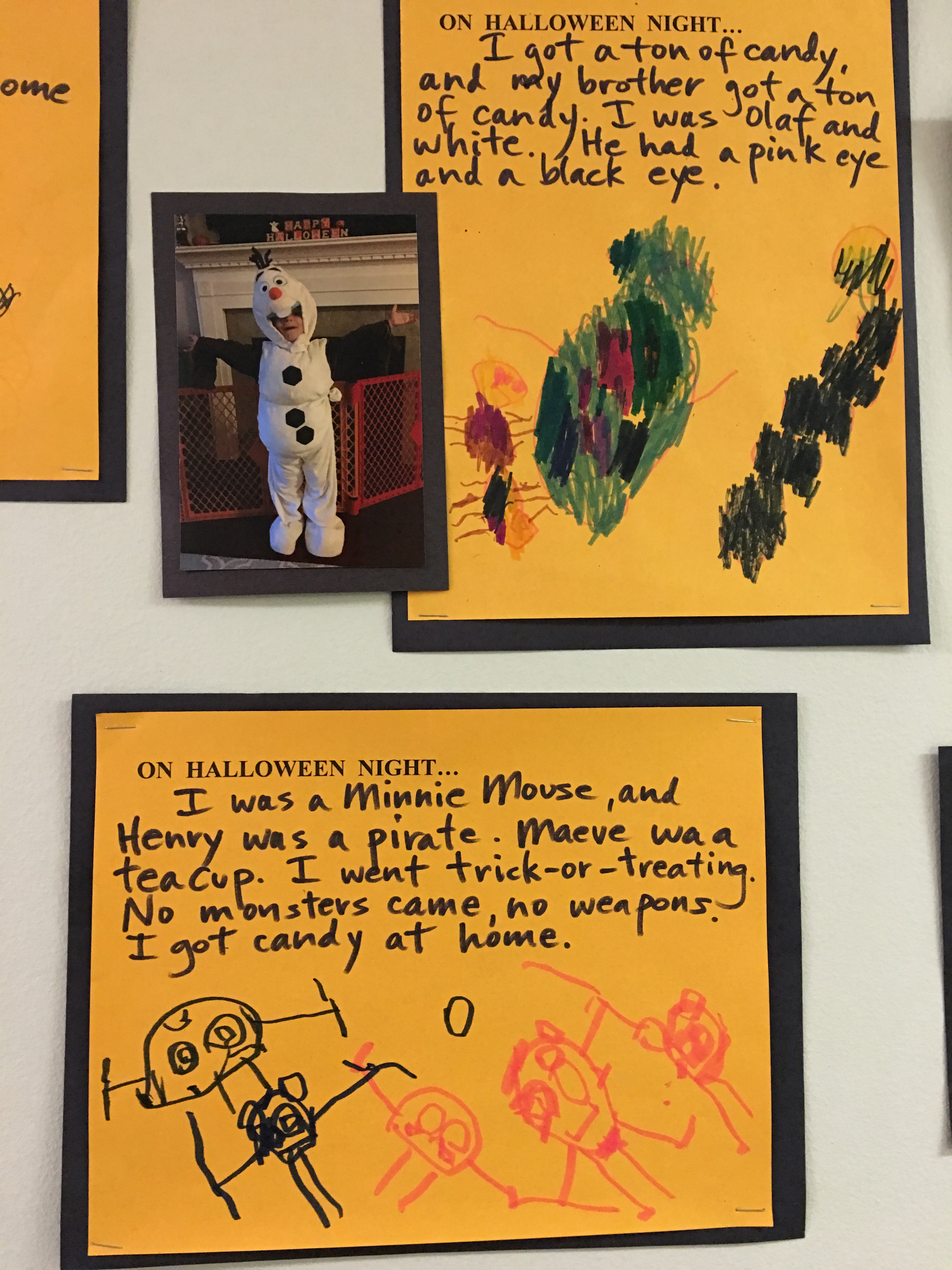 The day after Halloween we write picture stories again.  Children have many memories and thoughts.  By now, their language has become more descriptive.  Two months of reading-aloud is proof.