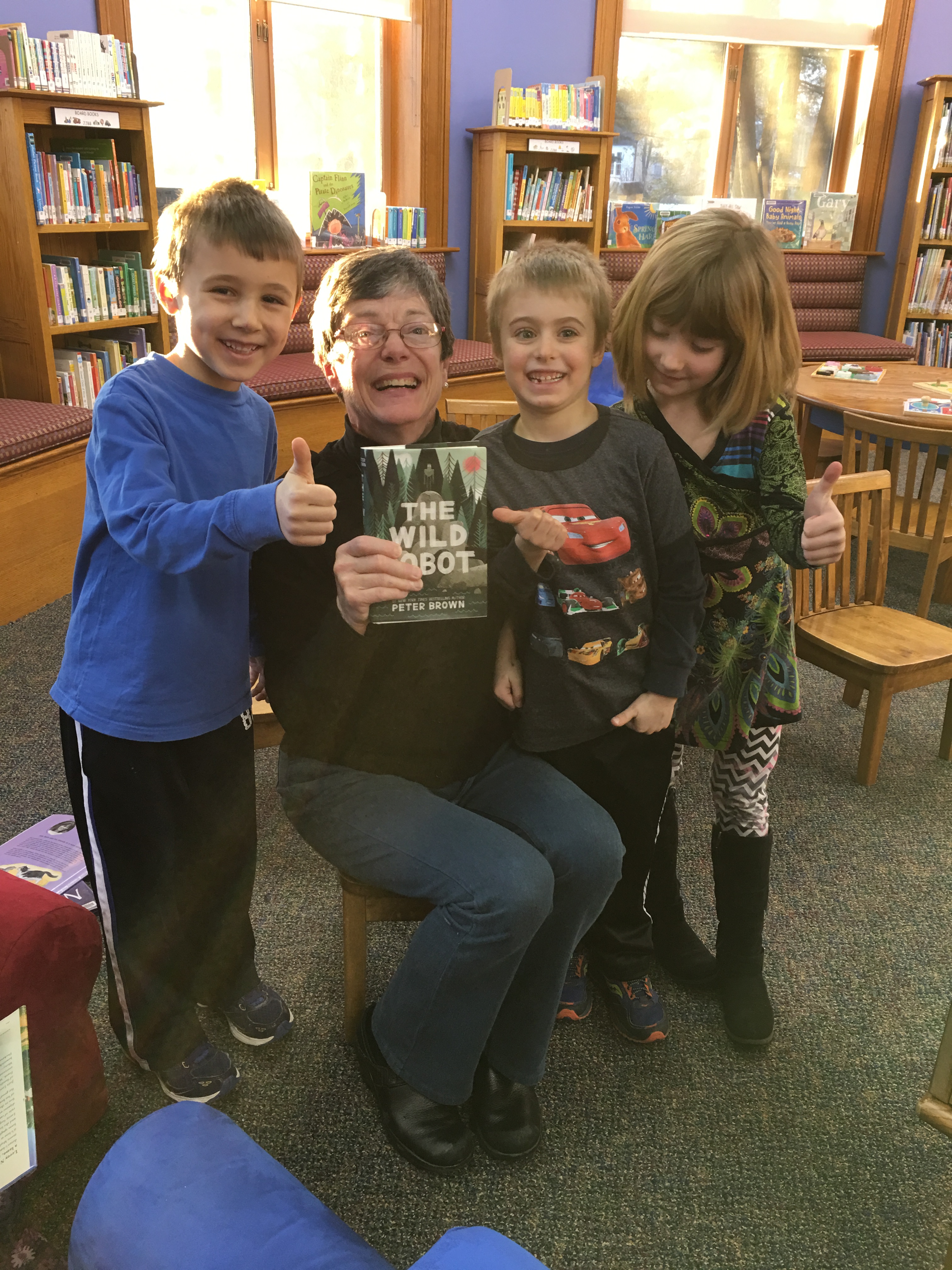 What could be better on this day than finishing reading a favorite book with my library reading group?  We have been reading The Wild Robot by Peter Brown since September.  Yes, September!  We meet twice a month to read, yet we talk, debate, laugh, worry, wonder…  That’s what happens with a good book.