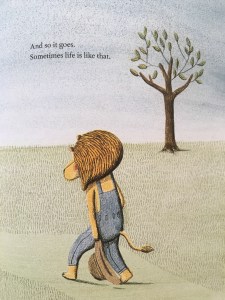 A lion is tending to his garden in autumn when a flock of birds passes overhead. One bird is on the ground, injured. Lion hears a sound, thus the beginning of the story. While he tends to the bird, the story is developing. “Oh no! They’re flying away.” Those few words spark…well, silence and then a long discussion, the kind that brings worry to the surface. Children need to know worry. Those five words were powerful.