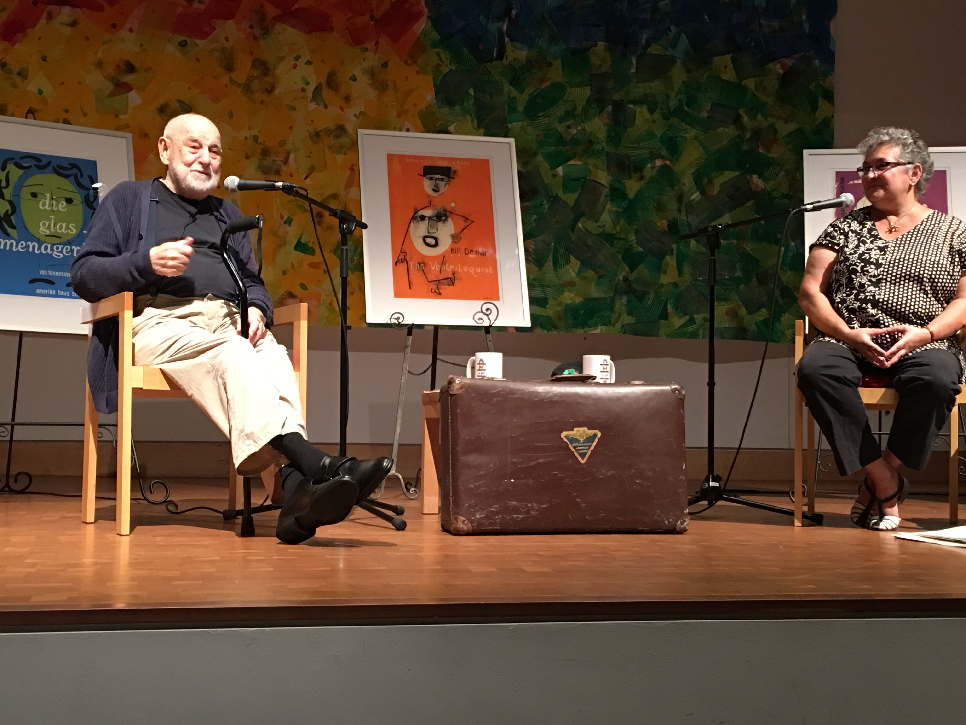 The brown suitcase on stage is what he had when he arrived in New York City, filled with advertising posters he had done for theaters.  And so began a conversation of fascinating stories, told with wit and humor, along with Annie Lionni.  The audience was captivated hearing this man speak.  I was front row center, the 50-yard line, right behind home plate.