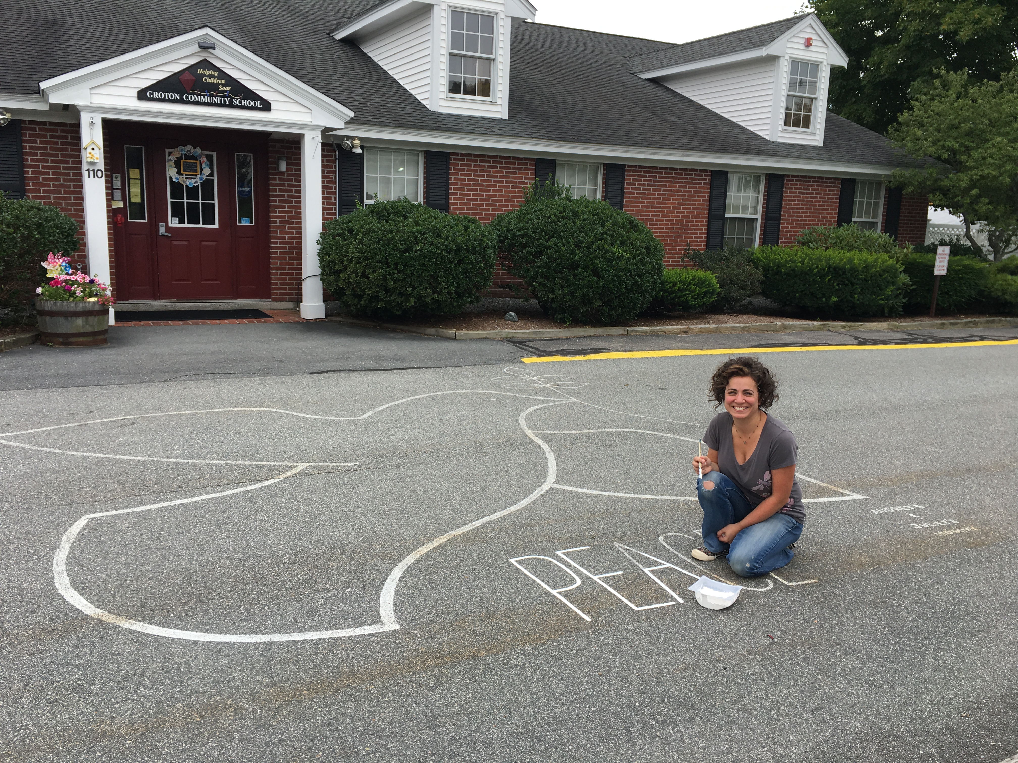 Years ago, when I first had the the good sense to listen to children, it struck me to paint a peace dove in our parking lot, right in front of the entrance to school.  Janine, an artist and parent of Juliet (Starry Night post) and Audrey, was happy to do the job.  Since then, she has returned many times to repaint this simple, beautiful bird.  It has become a symbol to welcome all the families and visitors who come into our school.  Crossing the threshold of peace.