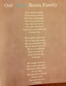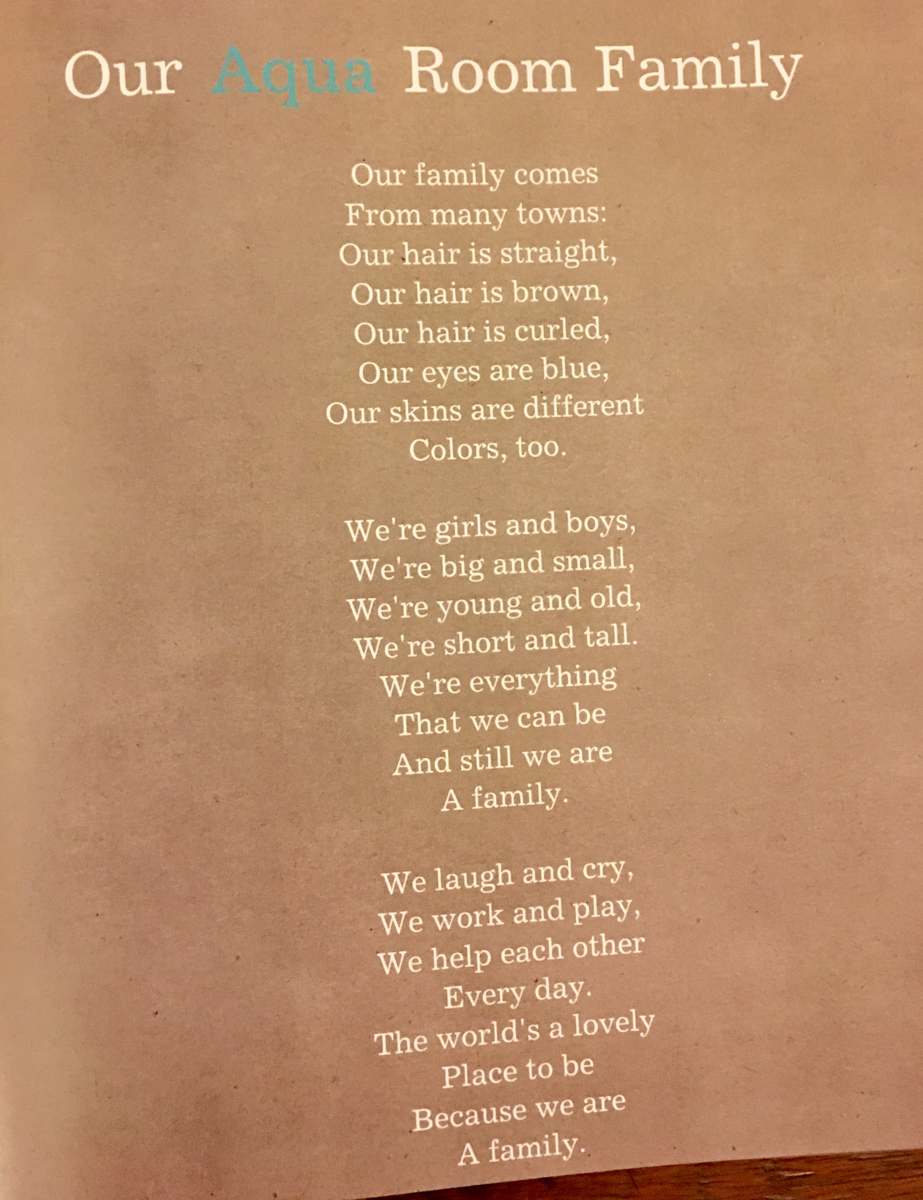 It was a book, Our Aqua Room Family.  Family.  That word somehow becomes cemented in September.  It is much like a badge, something everyone wears, feels and just knows.  We’re a family.