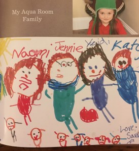 The following pages in the book were done by each child, drawing our Aqua Room family.  Page after page depicted a child’s view of  friends and teachers.