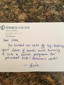 It reads, “Dear Noah, You knocked our socks off by taking your love of music and turning it into a music program for preschool kids!  Awesome work!”