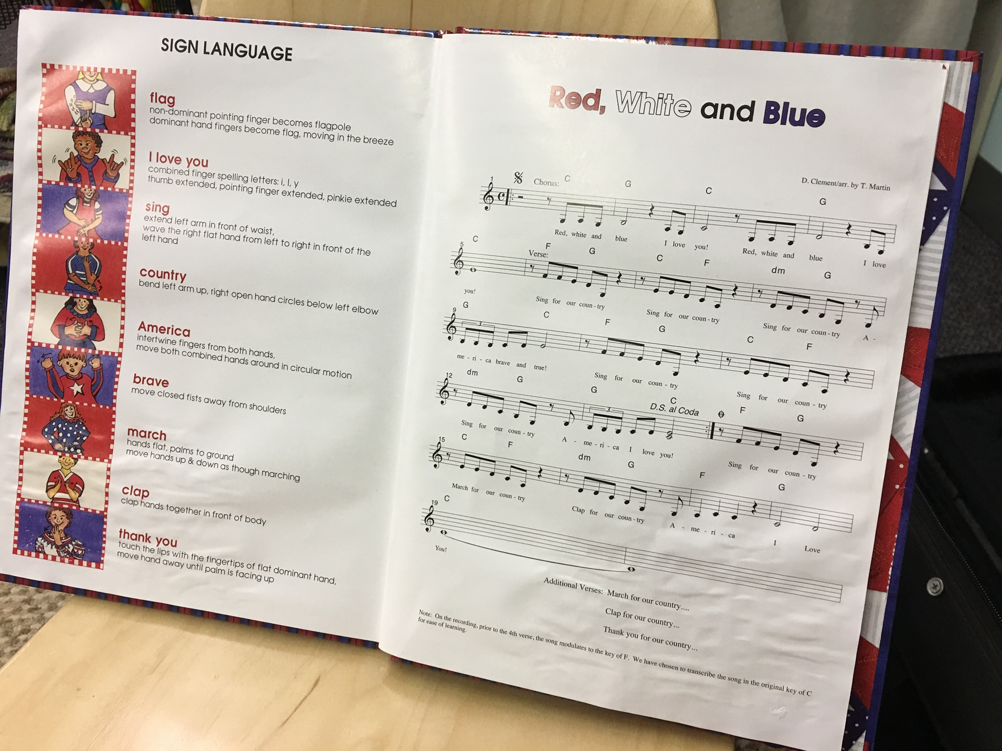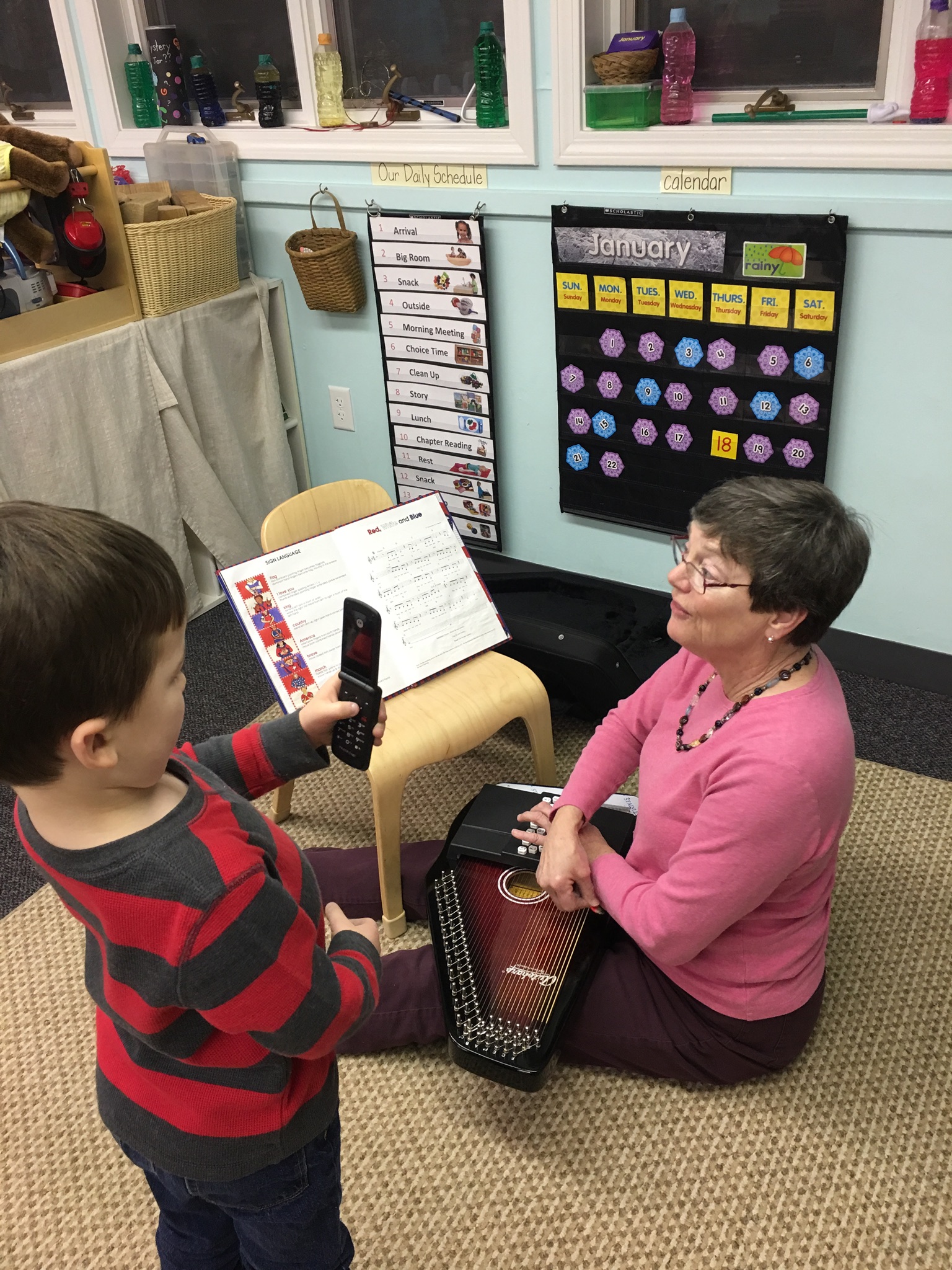 It was a rainy day.  There was extra time for music and the autoharp.  Children picked their favorite songs, and we sang and danced.  “Five Little Monkeys” was a top request, multiple times.  Then, children wanted to sing “Red White and Blue.”  With the autoharp.