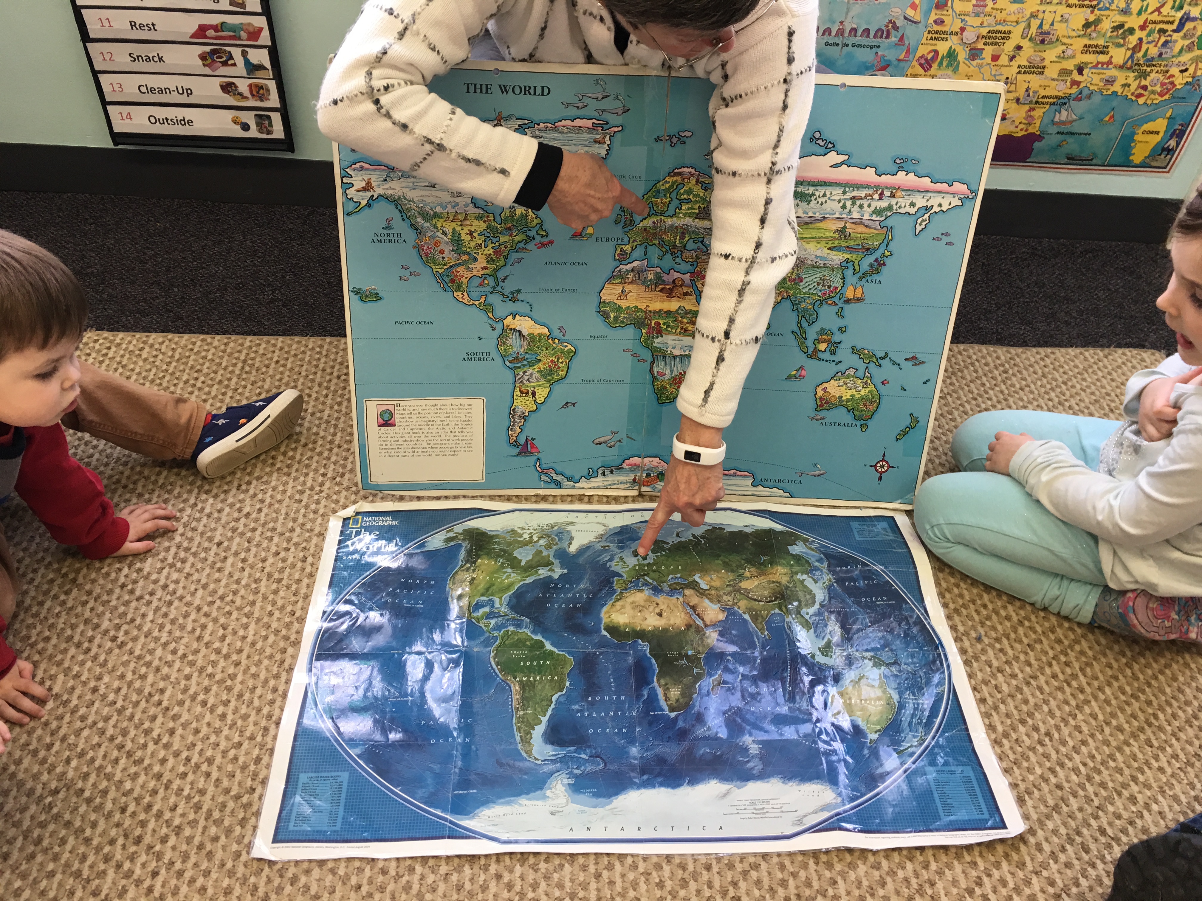 A few pages later a child said, “There’s a compass.”  Sure enough, a compass is featured throughout the book.  Our Big Book of the World has a compass on each page, and we often talk about north, south, east, and west.  Understanding the geography of the town is key to Katy’s snow plowing in the story.  And, this is just what we have been doing recently.