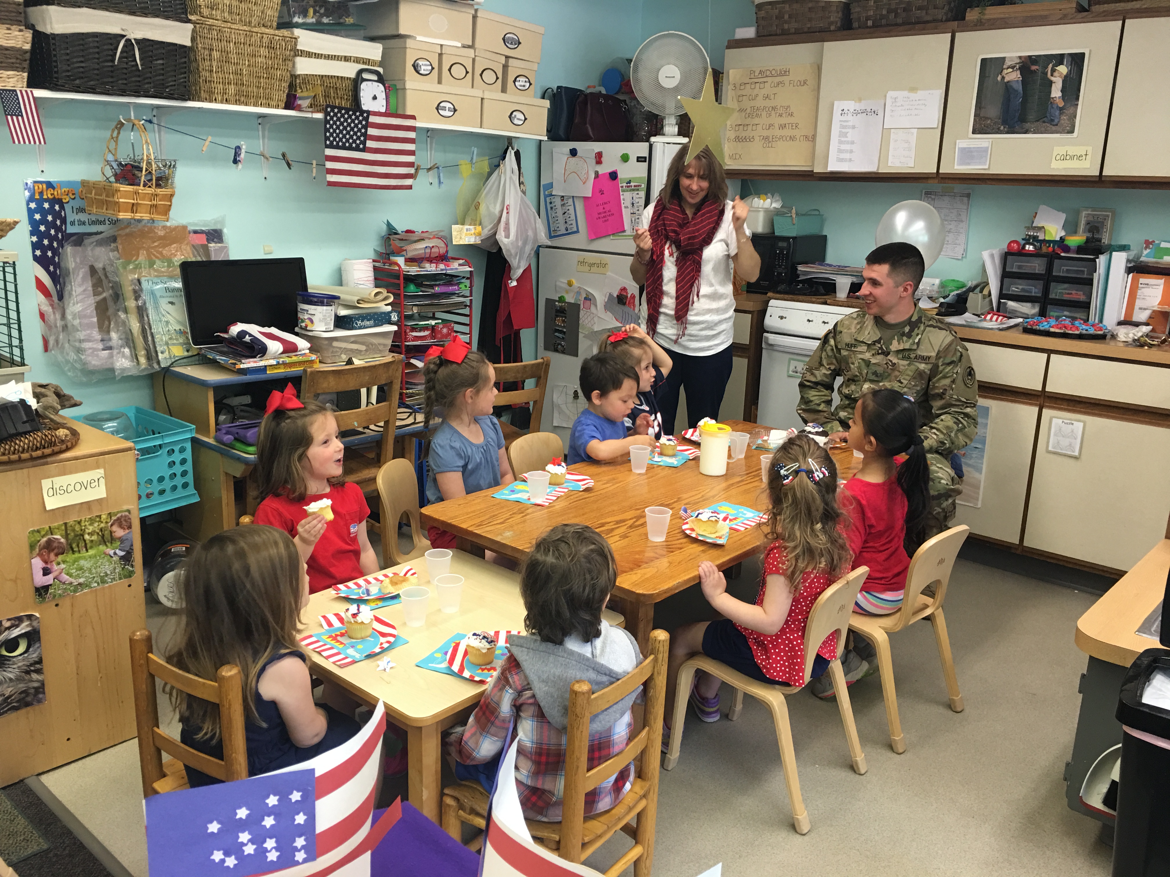 Each class led the crowd in singing a patriot song.  We sang, “You’re a Grand Old Flag” and “Red, White, and Blue”.  Then, the Yellow Room children sang “God Bless the USA”. When they sang the line, “And I gladly stand up, next to you…” every child pointed both fingers with outstretched arms directly at Sergeant Curren, when they said the word YOU. That line is part of the chorus, and the chorus is repeated many times in the song.  That means the YOU finger pointing thankfully happened many times.  Not many dry eyes.
