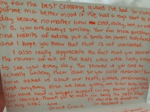 And so it continued throughout the rest of the school year.  Quotes from students started trickling in.  And good to his word, Steve made a list and gave it to the students.  Here is the collection of quotes from Steve the Crossing Guard’s students: