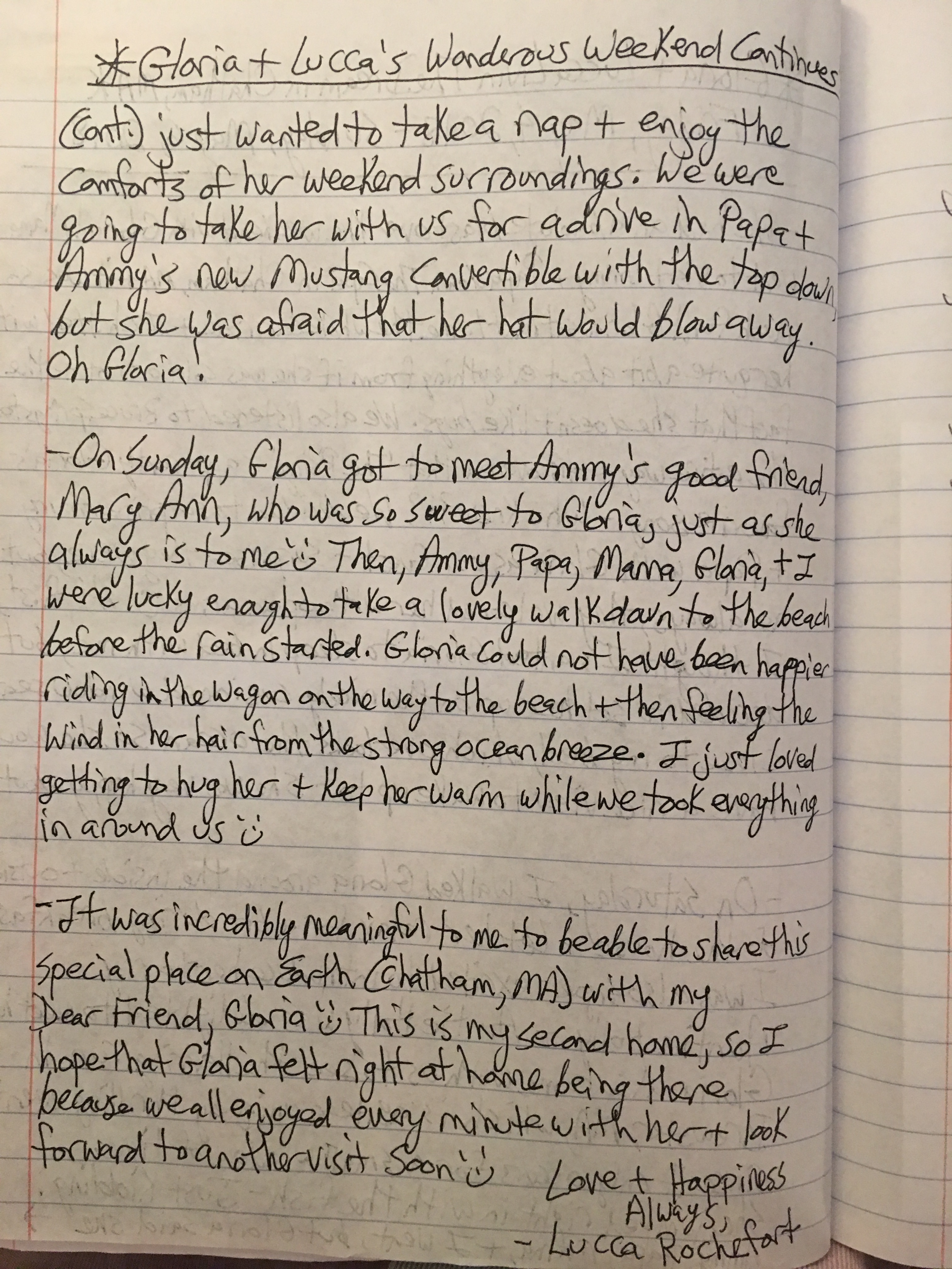 The first time Gloria went for a home visit, I was sitting in the children’s bathroom with a boy. He looked serious and asked me if Gloria had ever had a sleepover. I said no and I wasn’t sure she wanted to do that. His reply, “Don’t worry, I’ll ask Gloria. And she won’t be scared.” That was the same child who said that Peace made him feel “heart-y”. So, that was the beginning of sleepovers and weekends. She has been to a high school graduation, a play performance in Boston, a basketball game, sledding, helping to decorate a Christmas tree… a long and wonderful list of weekends recorded in her journal. Thank you, Marlene. I know that Gloria makes a huge difference and an impact on children. Maybe another book…