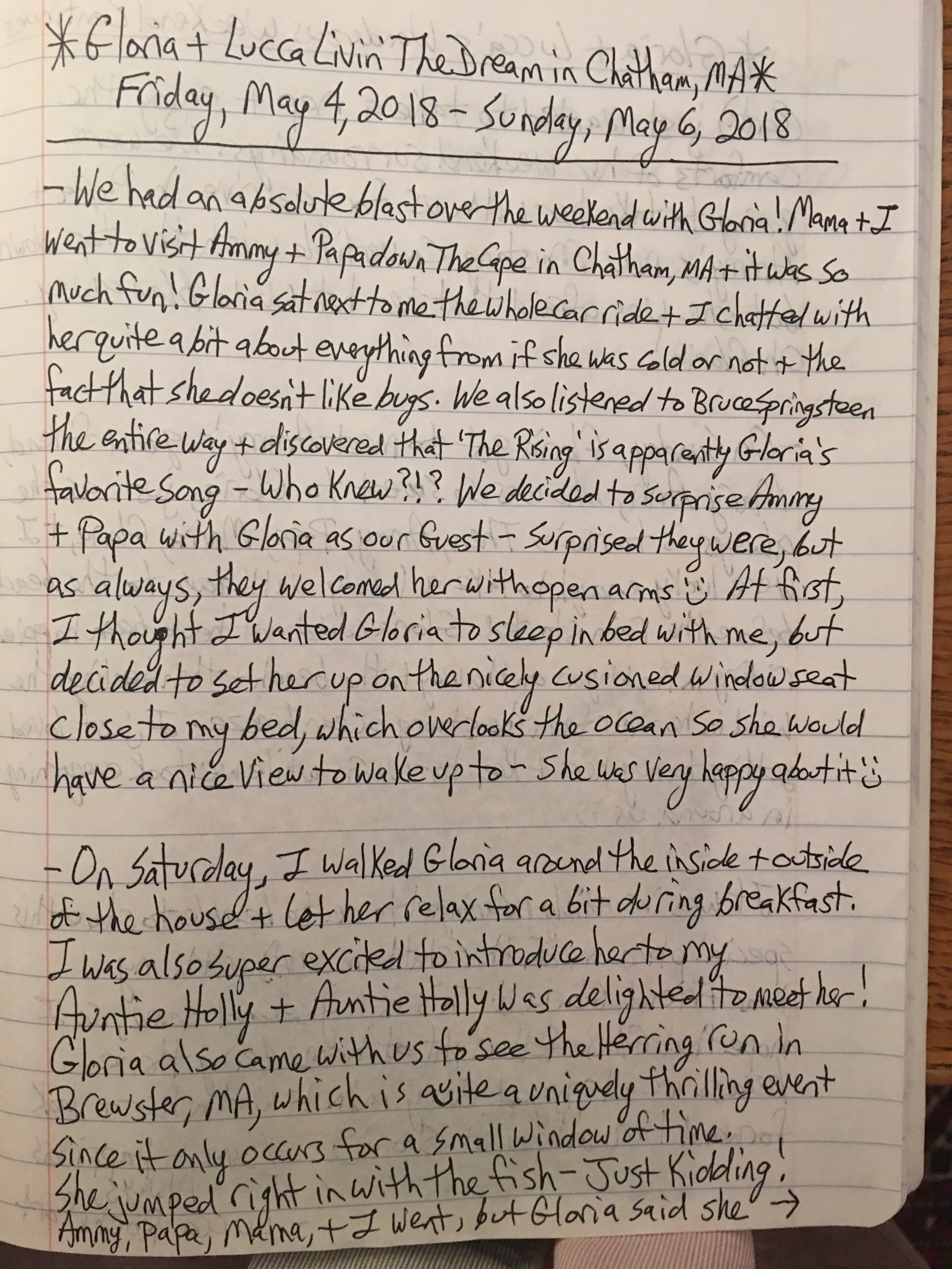 On Saturday, I walked Gloria around the inside + outside of the house + let her relax for a bit during breakfast.  I was also super excited to introduce her to my Auntie Holly + Auntie Holly was delighted to meet her!  Gloria also came with us to see the Herring Run in Brewster, MA, which is quite a uniquely thrilling event since it only occurs for a small window of time.  She jumped right in with the fish – just kidding!  Ammy, Papa, Mama + I went, but Gloria said she just wanted to take a nap and enjoy the comforts of her weekend surroundings.  We were going to take her with us for a drive in Papa and Ammy’s new Mustang convertible with the top down, but she was afraid that her hat would blow away.  Oh Gloria!