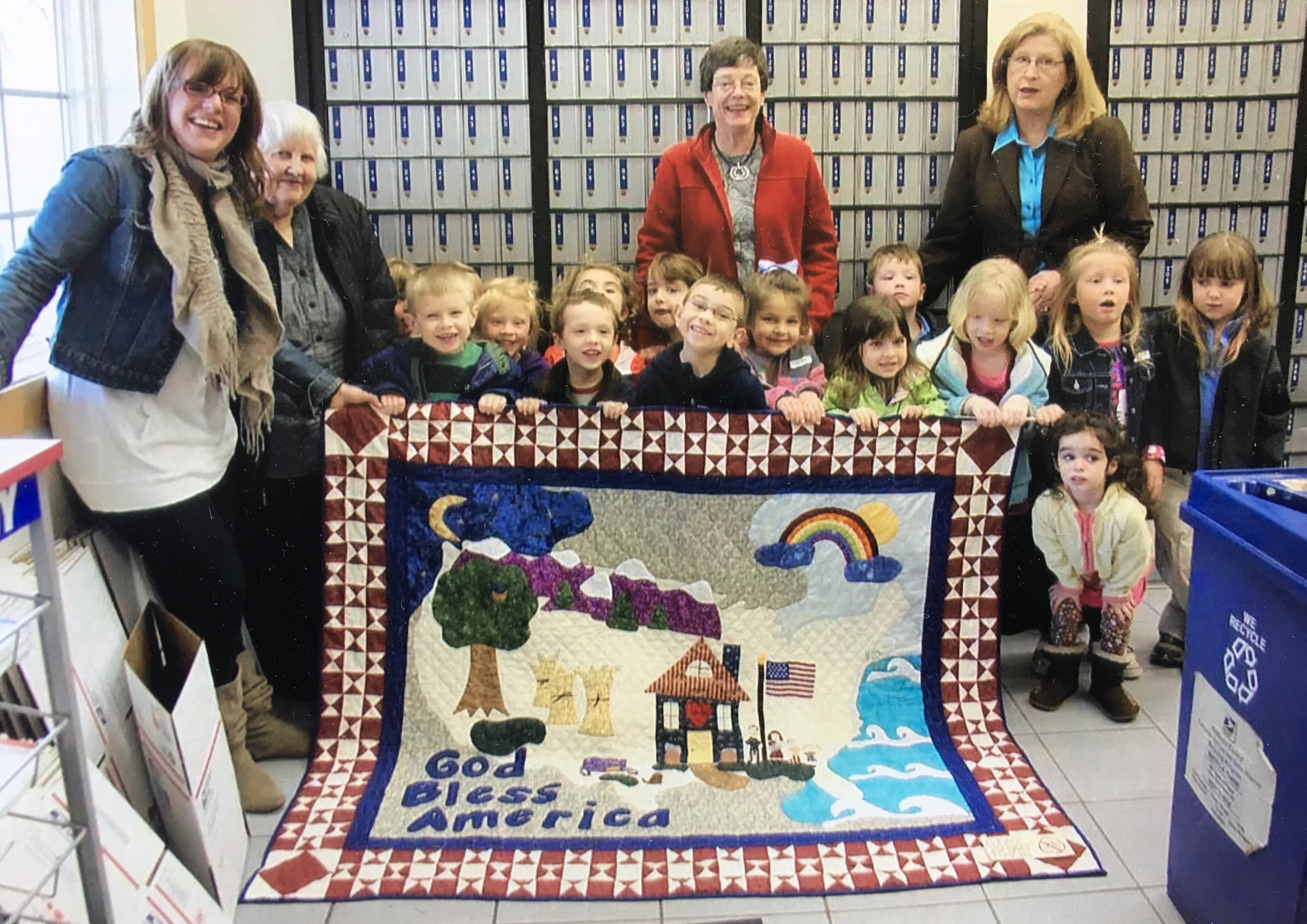 The newspaper wanted to do an article, and the Post Office wanted us to hang the quilt for ‘the world’ to see.