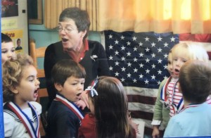 “Jennie, can we sing again?  Can we sing “God Bless America?”  This was what I heard from children, every day.  I sing many songs with children, all kinds of songs.  So, why was this particular song the favorite?  I don’t know.  But, what I do know is to pay attention to children and what they gravitate towards.  My lesson plans might be terrific, but I know intuitively that what children are drawn to is far more important.  I paid attention.  And it grew.  When children were in the playground they started singing on their own for other children.  They sang all the time for Milly.  She joined in, and she loved it!