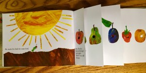 The editor wasn’t crazy about a worm.  When she suggested a caterpillar, Carle immediately said butterfly, and the story was born.  The favorite part of the book for children, also a nightmare for the publisher, is the five pages of fruit for each weekday – with a hole through the fruit.  Carle’s inspiration came from using a holepunch at work.