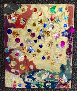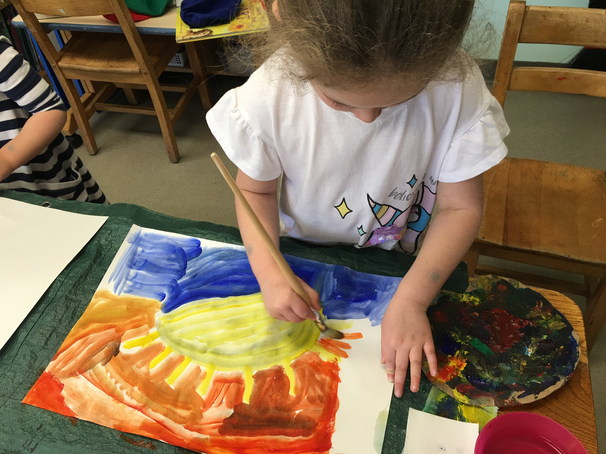 And so, we were ready to paint, using real artist paints in tubes.  We spent much of the week painting, often working on a piece over and over again.  We painted like Kandinsky.  Mia was moved by Monet’s Haystacks, and worked tirelessly on her own sunset and sky.