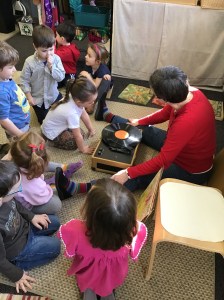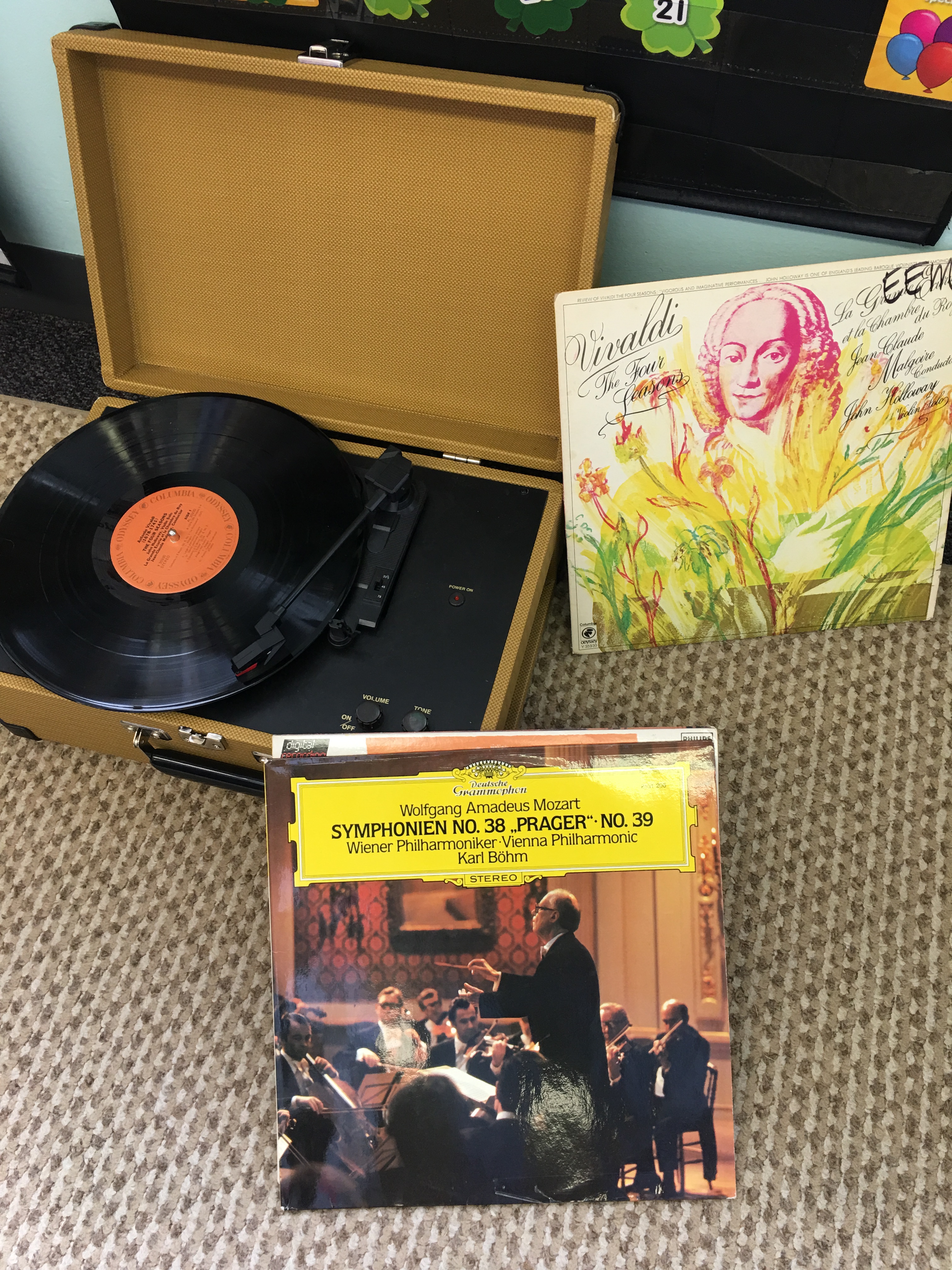 Children were spellbound as I lifted the lid.  I slowly touched and played with the turntable and the arm.  Then I pulled out a record album and put it on the player.  Children thought it was a giant CD.  I turned it on, explained how the needle works, and rubbed my finger across the needle – what a surprising sound.  When the moment came to play the record, Vivaldi’s Four Seasons (Italian, of course), the music was a giant wave of wonder.  The sounds poured out and filled the classroom.  Kandinsky must have felt the same way when he went to the opera.