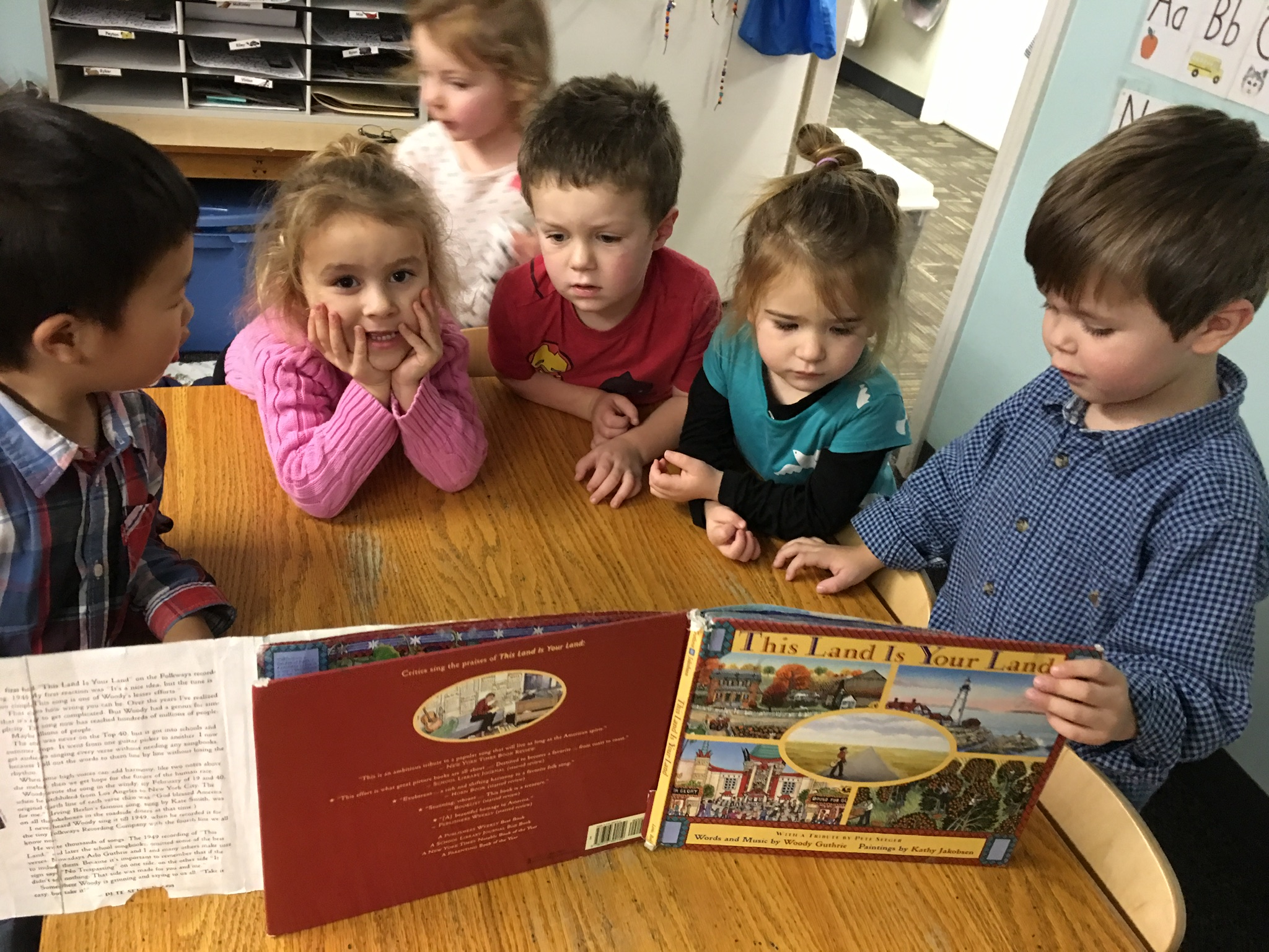 It was a regular morning in the classroom.  Children were finishing snack.  The routine is they get a book and have silent reading (or not so silent) while other children finish their snack.  Of course there are a few children who try to eat quickly so they can have first dibs on a book.  This Land is Your Land is always the first to get picked.  And, it’s hard to read the book and not sing, or at least hum.  On this particular morning, multiply that tenfold.