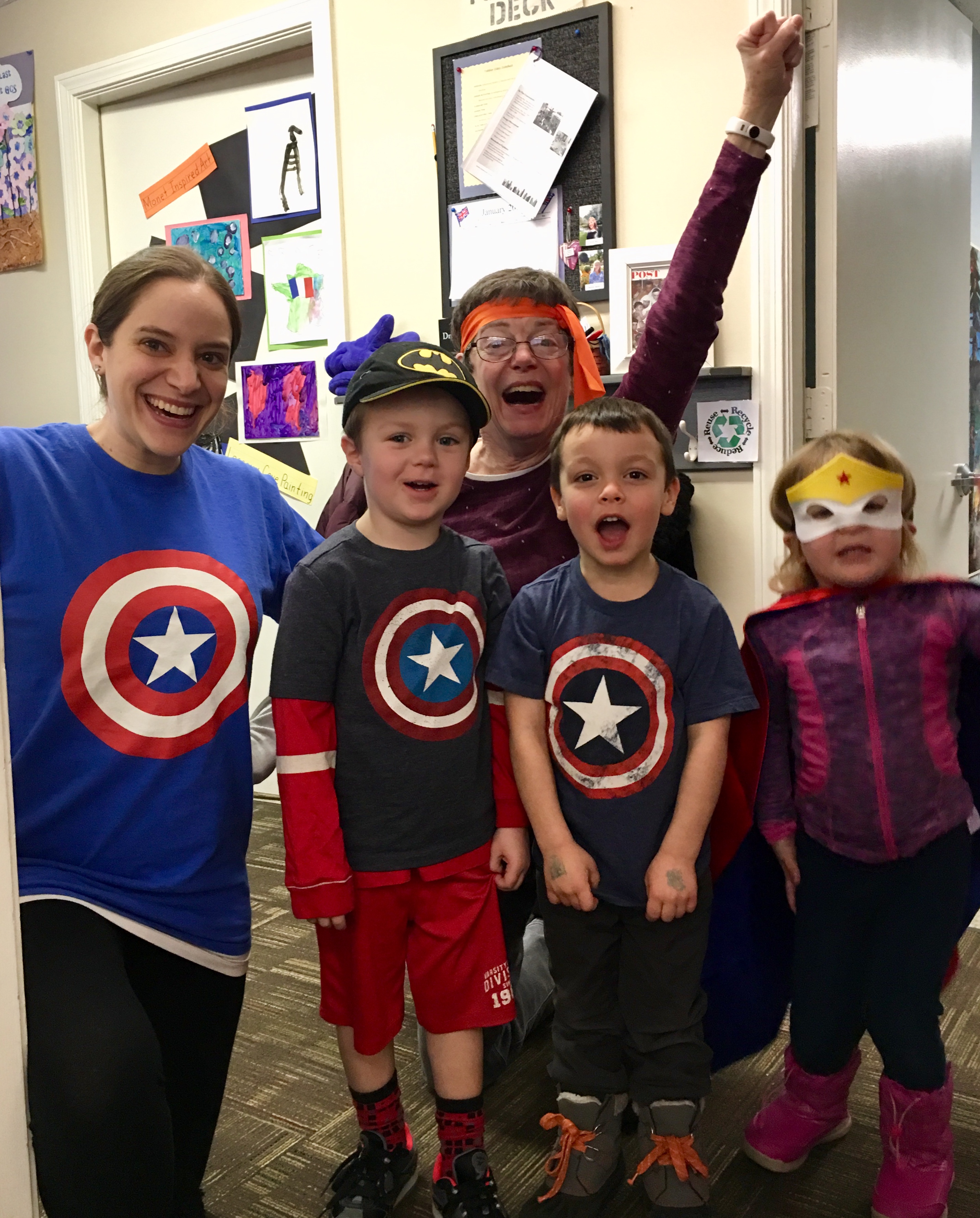 Riley and I are the two non-Captain America Superheroes in this photo.  But day in and day out, Riley is the real Superhero, the one who is always brave, helps her friends, and leads the way.  Always.  And with a smile.