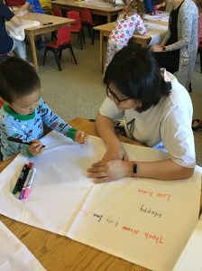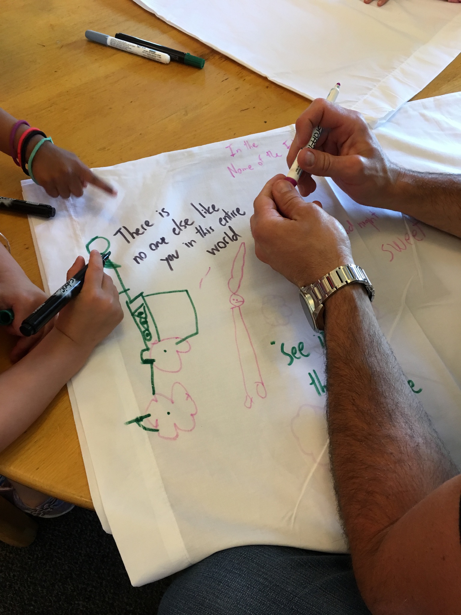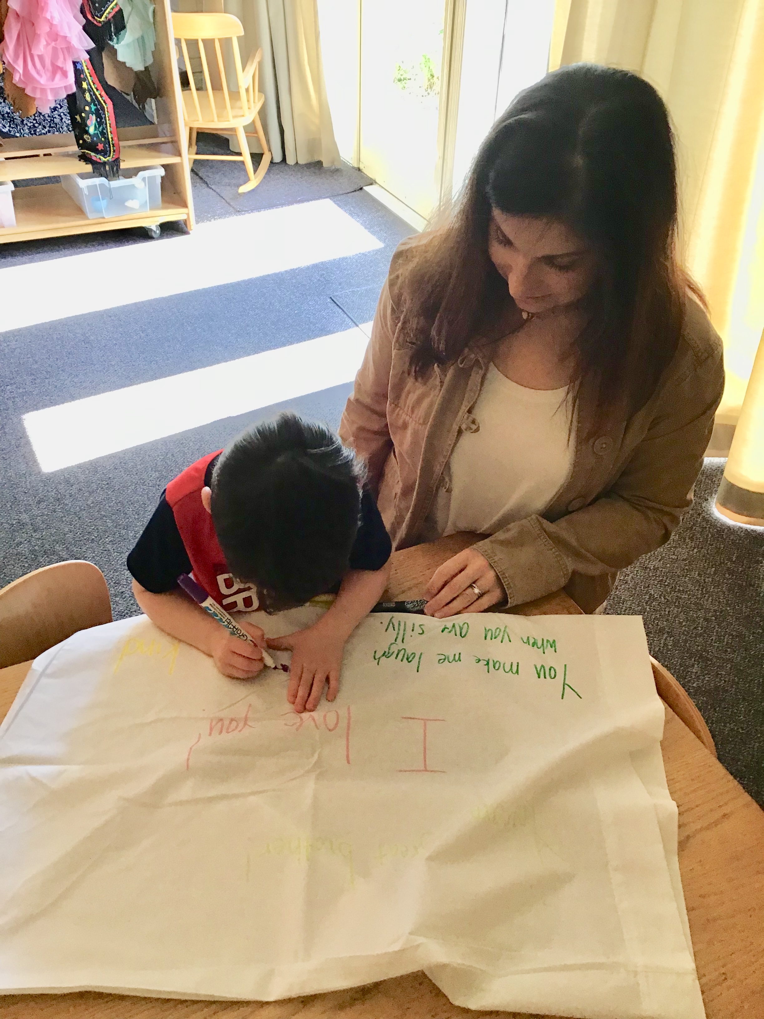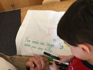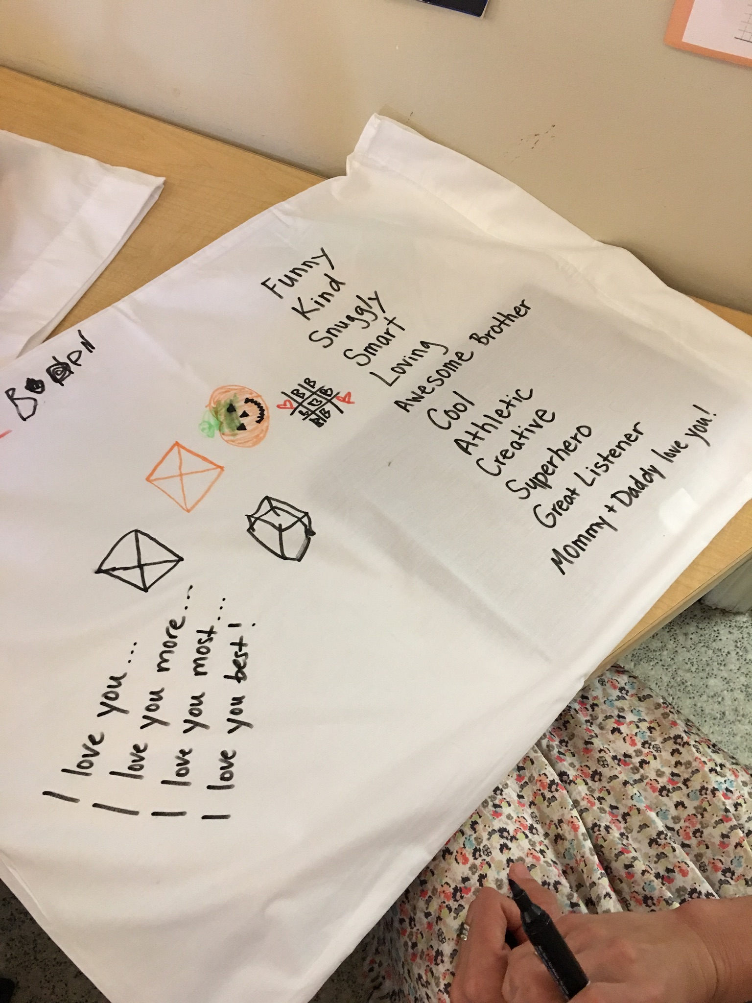 Children wore their PJ’s.  I passionately told parents how important it is for the brain to hear positive words before falling asleep. Parents and children were to decide – together – what words / phrases / terms of endearment would be most important and meaningful. Parents wrote the words.  Children decorated.
