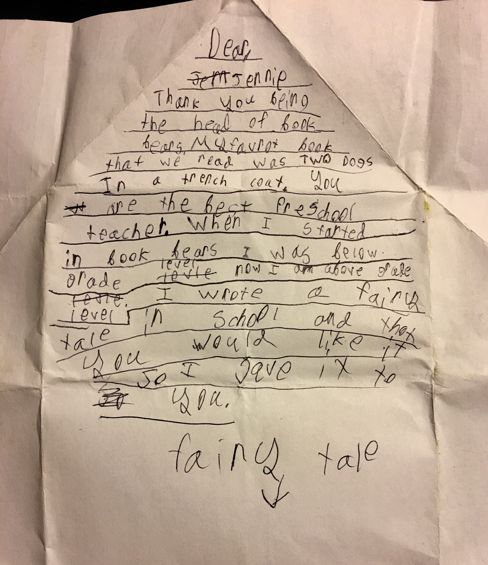 Dear Jennie, Thank you for being the head of Book Bears.  My favorite book that we read was Two Dogs in a Trench Coat.  You are the best preschool teacher.  When I started in Book Bears I was below reading grade level. Now I am above grade level.  I wrote a fairy tale in school and thought you would like it so I gave it to you.