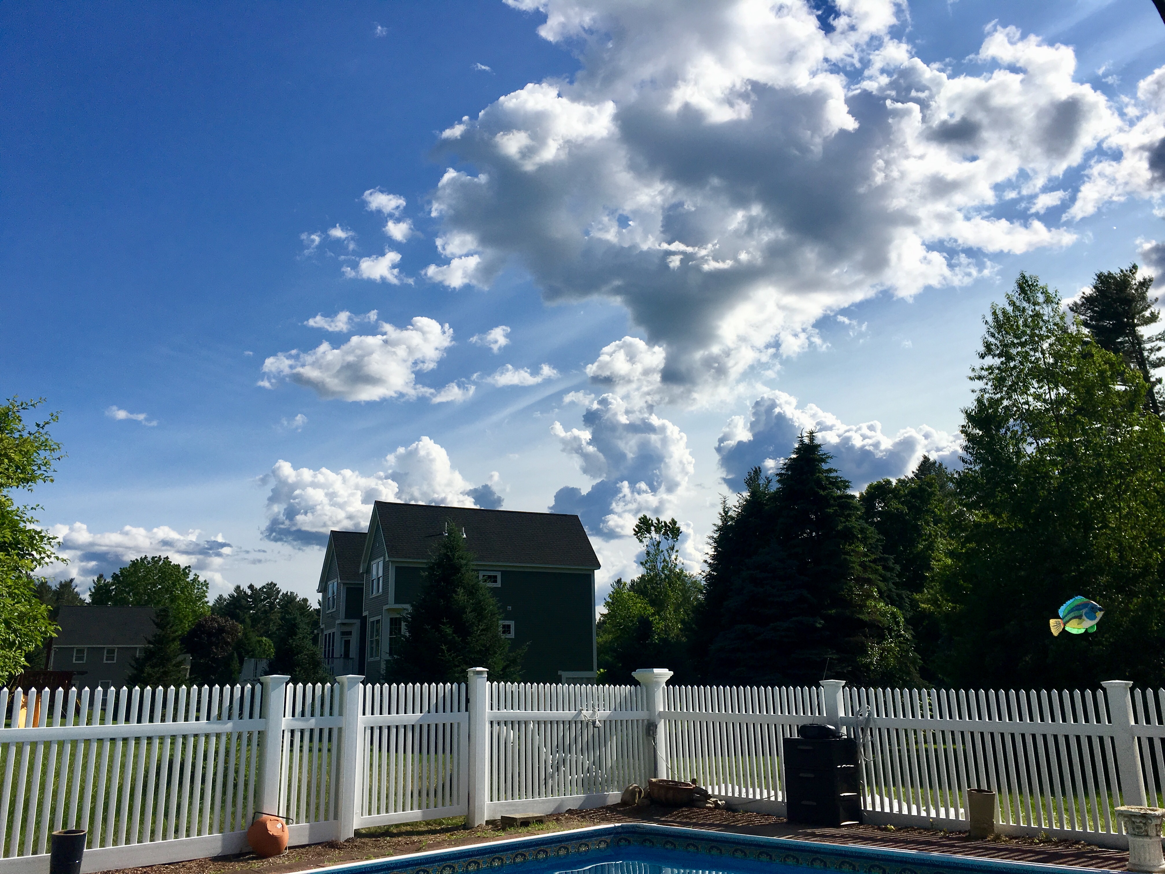 I knew I should have explained that. We have a multitude of fish decor (that’s an understatement 🙂) , from large panels of metal fish to individual fish that hang on the fence posts and panels. Some are jeweled, some are windsocks, some are plates, and some are wood. No two are alike. It’s like an artisan’s shop. Today was arrange and plan and begin. Much more over the next few days. We call our pool, in such a lovely setting, our vacation home. Thank you for asking, Anneli!