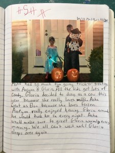 “Asha had so much fun going trick-or-treating with Aaryan and Gloria.  All the kids got lots of candy.  Gloria decided to dress as a cow this year because she really loves milk.  Asha went as Elsa because she loves Frozen.  Aaryan really enjoyed having Gloria around, he would tuck her in every night.  Asha would make sure to greet Gloria warmly every morning.  We can’t wait until Gloria sleeps over again.”