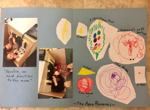 The best part was including photos of the children being astronauts in our home made spacecraft.  Of course they’re on their backs with a control panel and a phone to call Houston.