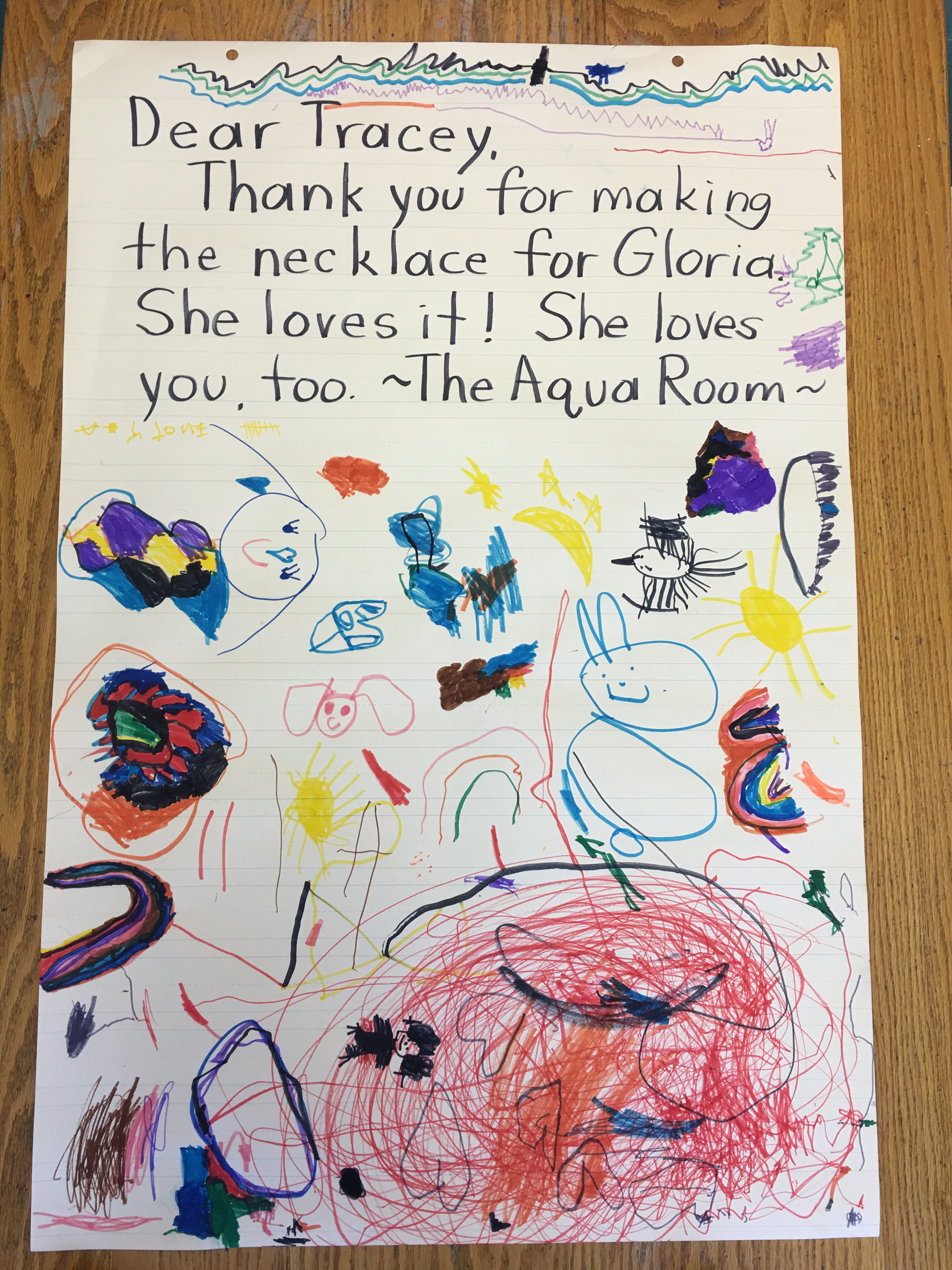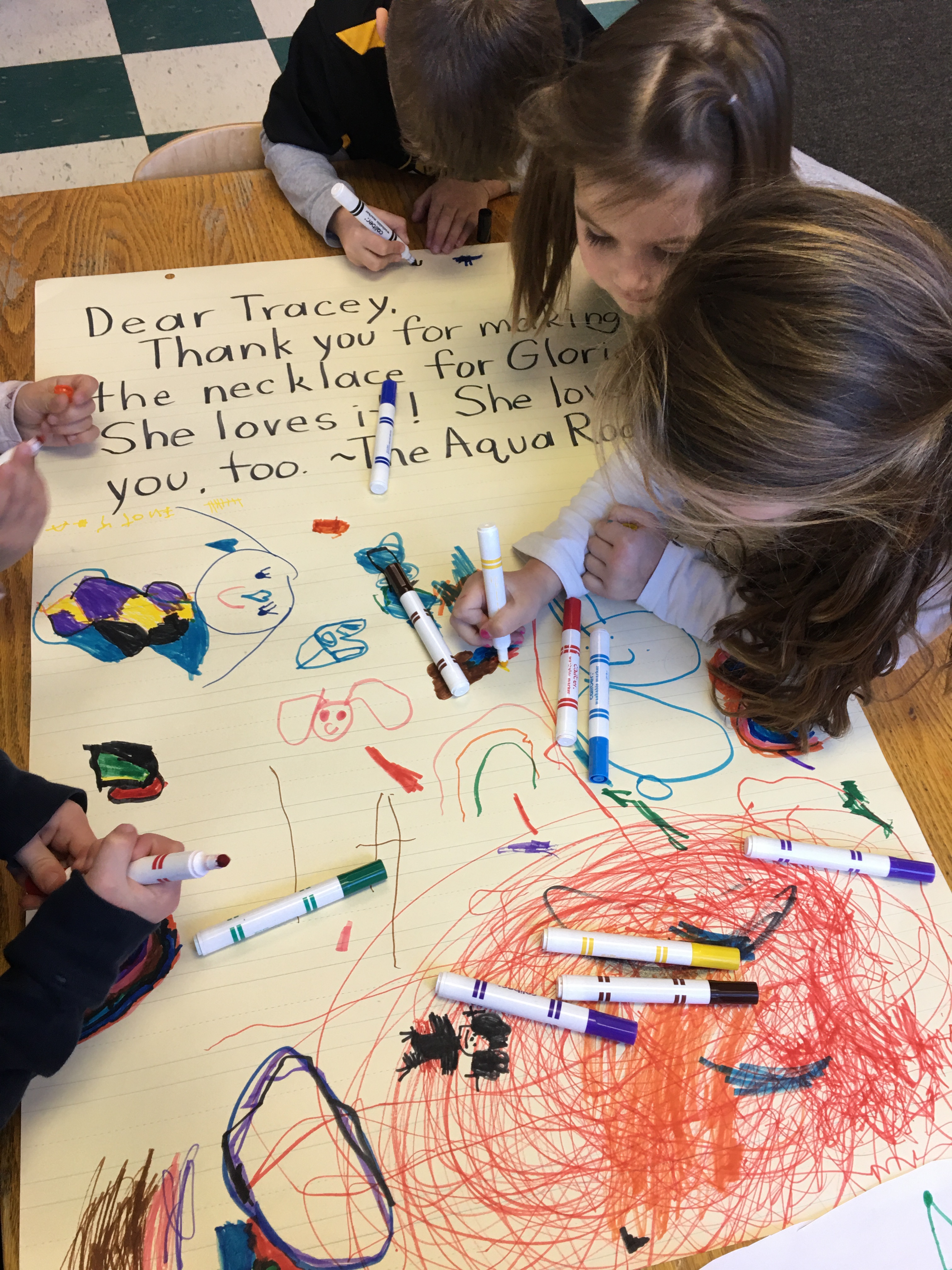 It was a great pleasure for the children to make you the big thank you note, Tracey. You worked more miracles than you know. Your necklace has brought more kindness and understanding into the classroom, not to mention big smiles from Gloria. I’m so glad it gave you joy. That is wonderful! Thank you!! ❤️