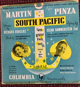The tears came with “Some Enchanted Evening” from South Pacific. It ripped at my heart.  An older man and a younger woman, children he had previously fathered – all come into play with this song.  This was my first introduction into an unconventional love relationship.  Rodgers and Hammerstein went even deeper, with a love affair, racial prejudice, and the issue of social consequences.  That was strickly taboo in the early 50’s.  Yet, it was natural and welcoming in the Broadway show.  When young Navy Lieutenant sang “Carefully Taught”, it was my first introduction to diversity and acceptance.  I have never forgotten.