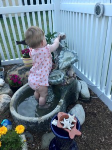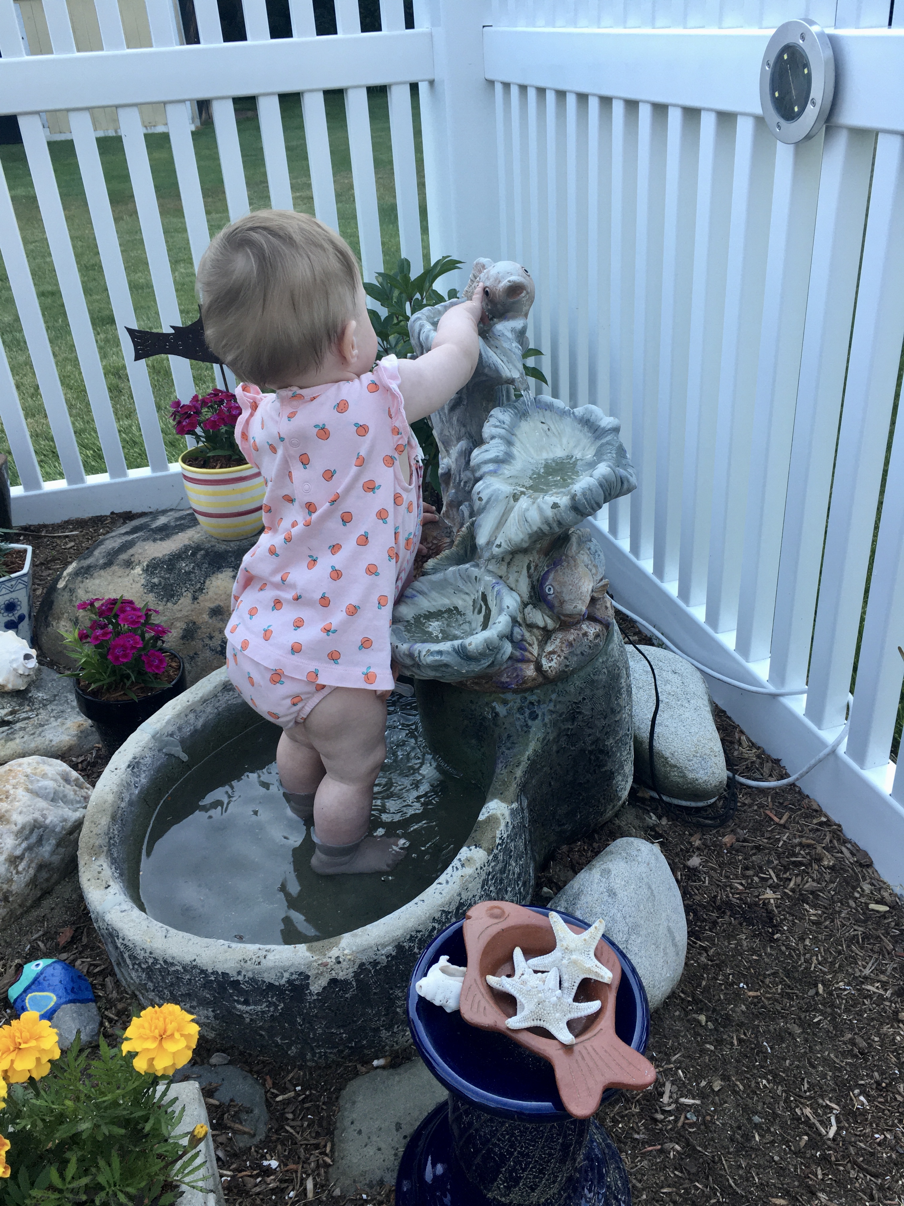 She wanted to feel the flowing water, so she stood the whole time. I think she would have sat down if we turned the fountain off.