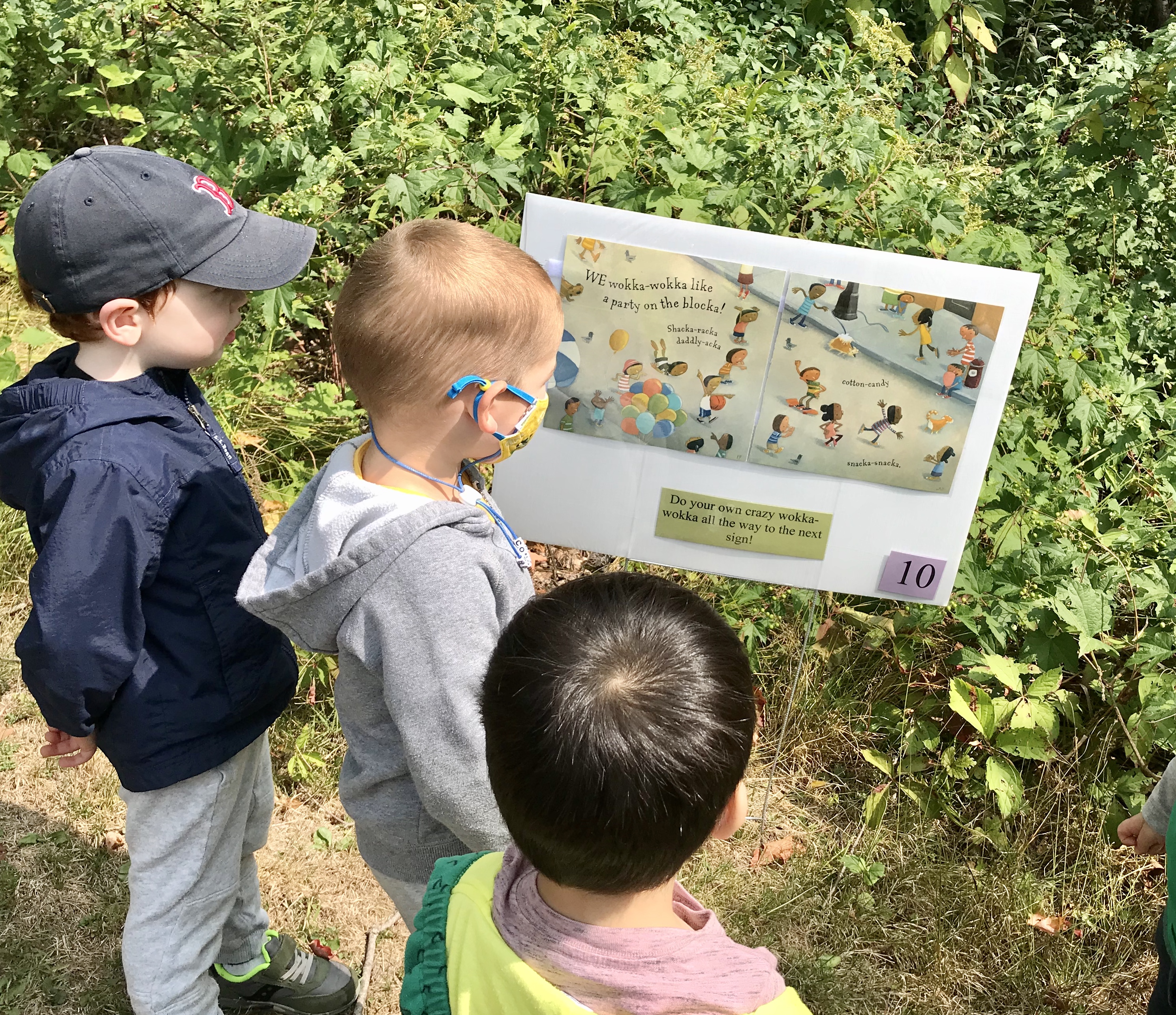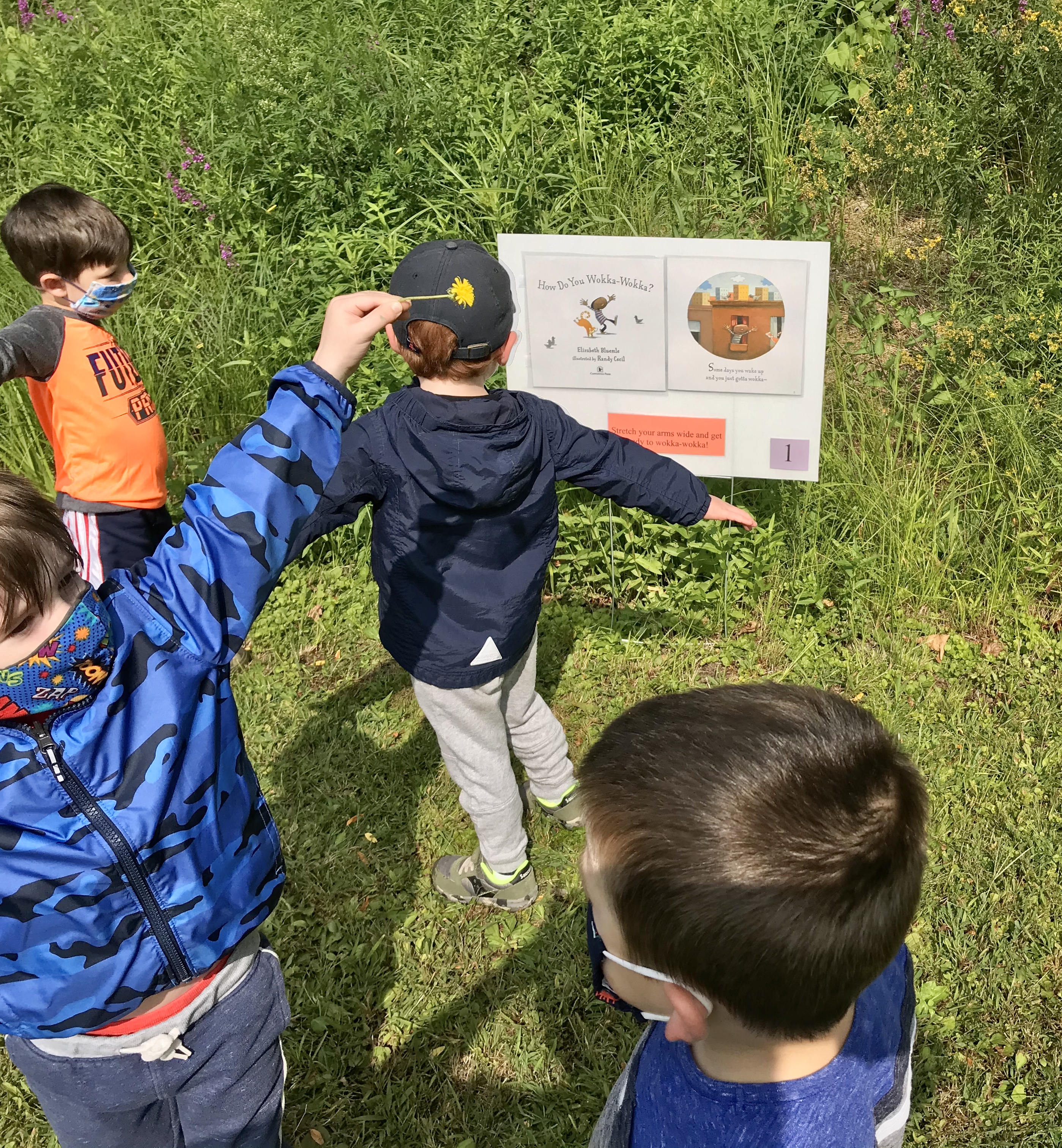We have a StoryWalk close to the playground.  There are twelve poster-size yard signs, each depicting a page in the book “How Do You Wokka-Wokka?” and challenging children to move in different ways.  Can you stand on one foot while raising your opposite hand?  Can you dance?  The book inspires movement, and is perfect for a StoryWalk.