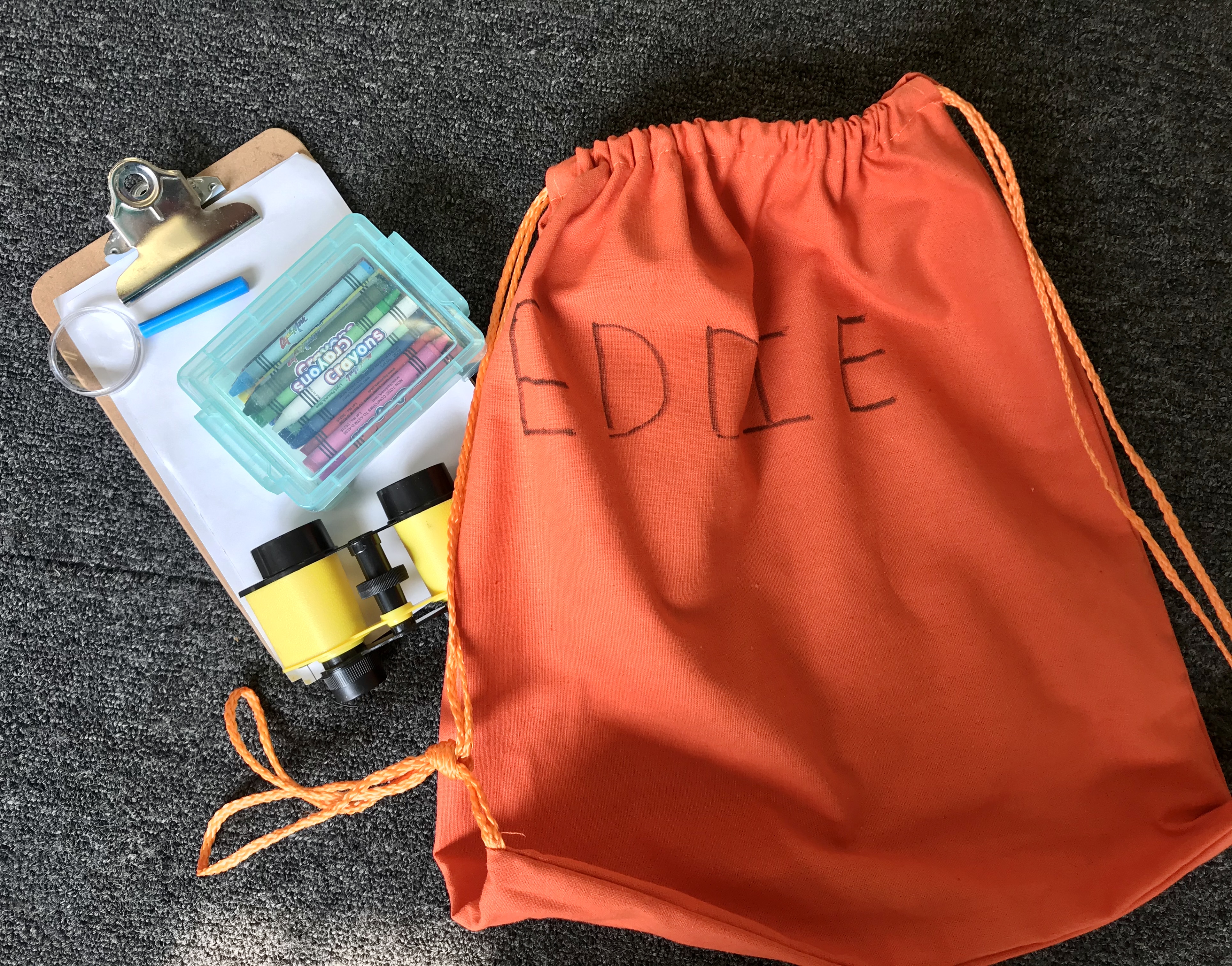 Our play packs are perfect to bring along.  The tools inside include binoculars, magnifying glasses, crayons, and a clipboard for drawing and recording our finds.