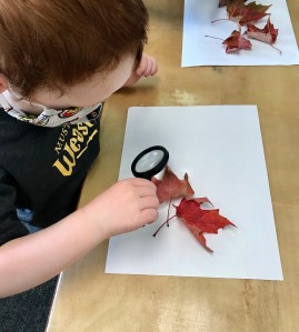 We brought the red leaves into the classroom and made an impromptu science table with magnifying glasses for children to explore the leaves.  This was an important follow through to discovering the red leaves.
