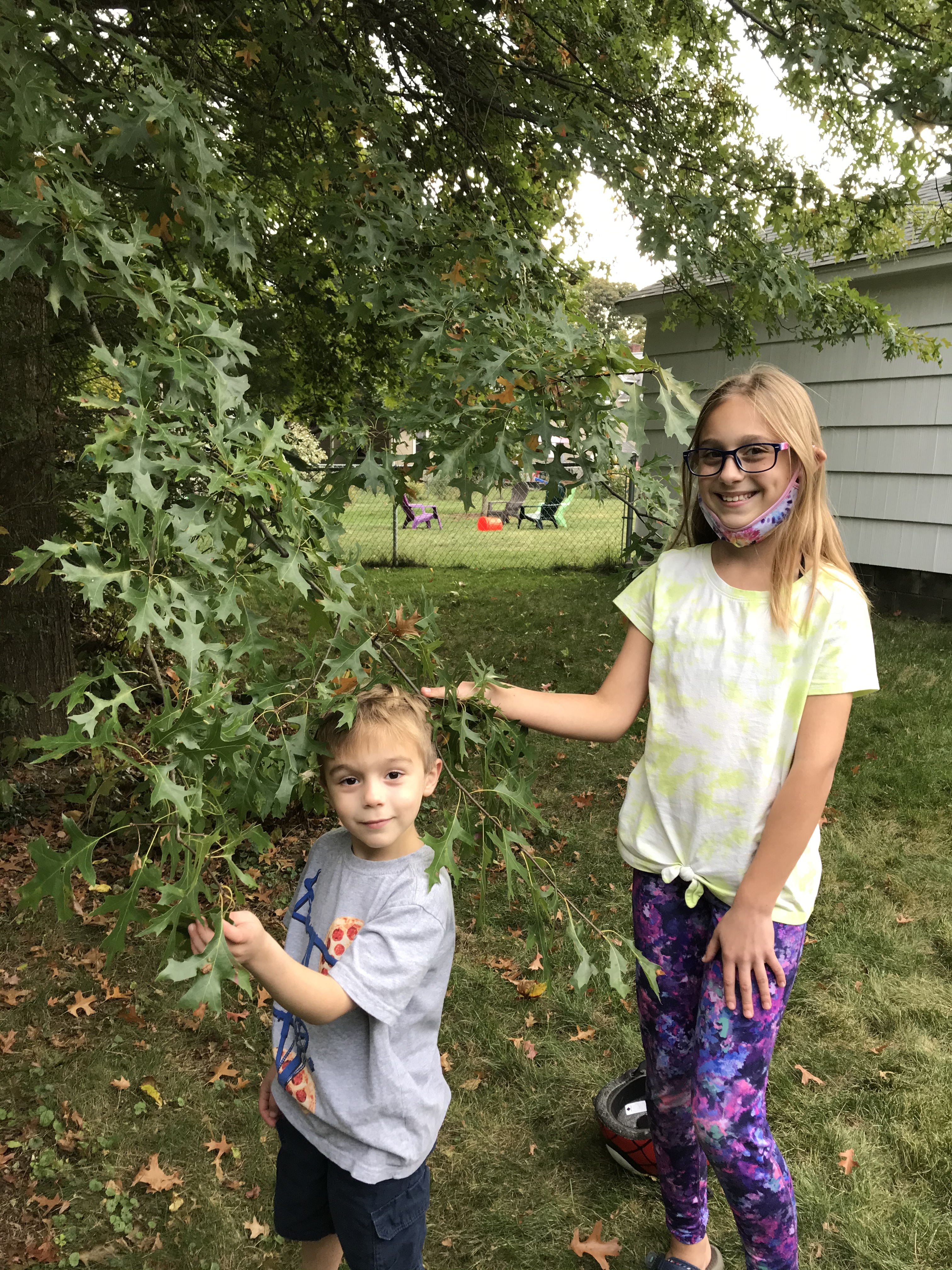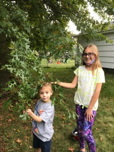 I am continuing my reading aloud to Miles as he recovers from his brain injury this summer. I posted his story August 24th, “Reading Aloud to the Rescue.” This week, the tree in his front yard had the same branches. How could that be? I asked Miles and his sister to stand by the branch so I could snap a picture.