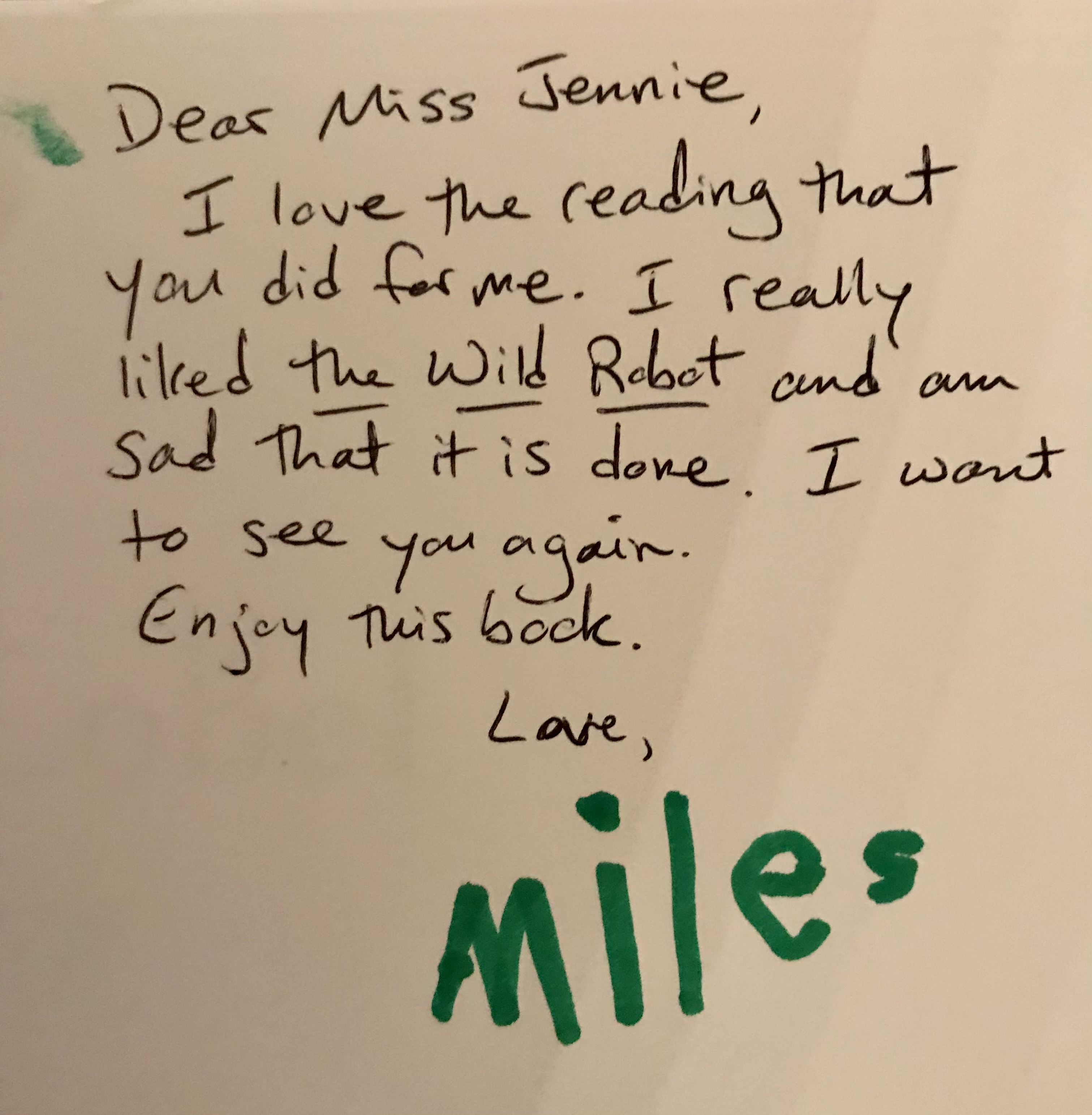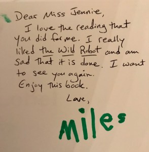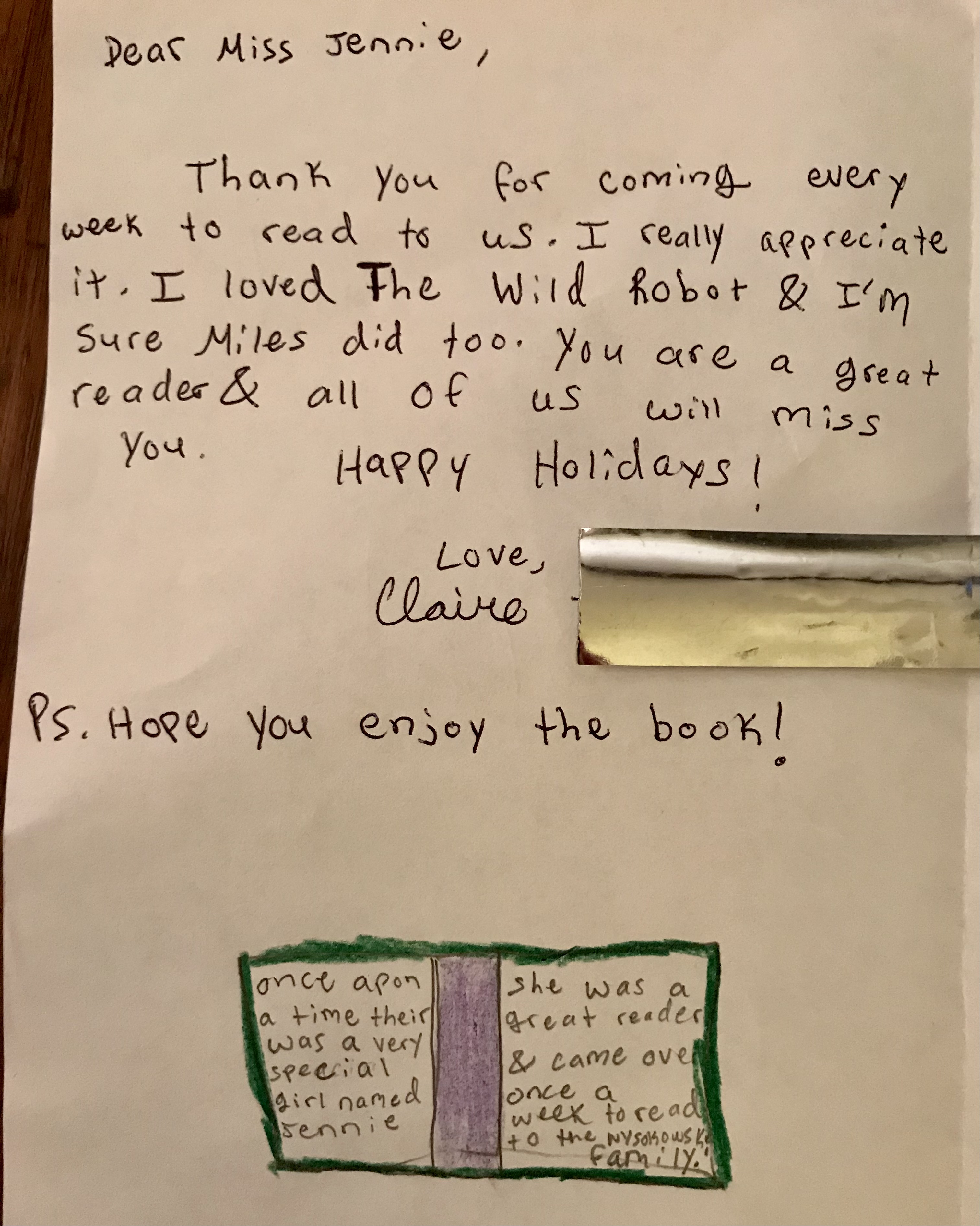 I know what you mean. I think these are ‘the’ moments, and I think Miles and Claire will remember. Claire wants to read the book on her own. She’s in third grade. When I told them I was giving them the book and the sequel, Claire was over the moon. Miles was excited. They want to know what happens to Roz!! Yes, Claire’s tiny book is precious! I just feel so lucky to be there and do something that is important.