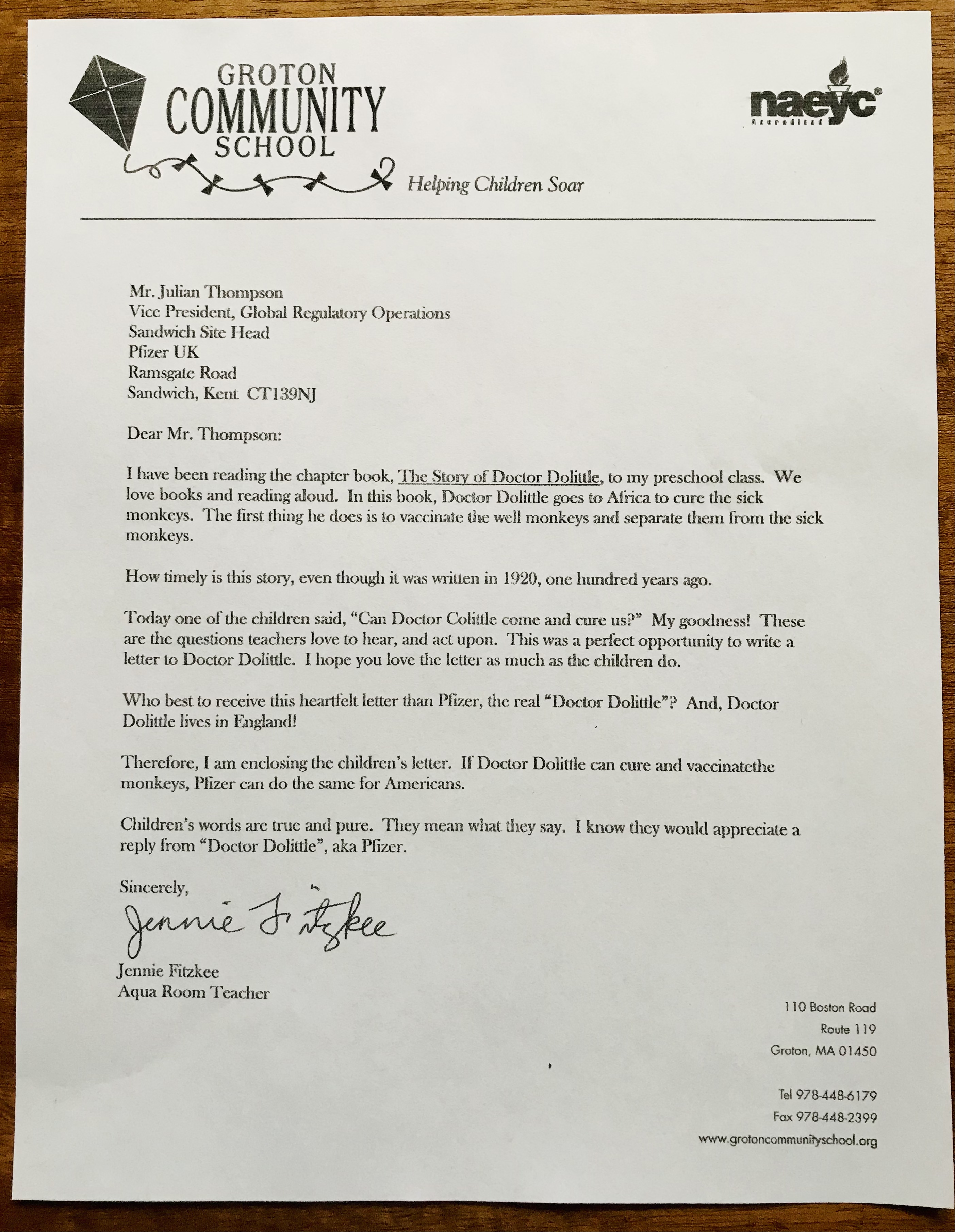 To whom do I mail this wonderful, important, heartfelt letter?  Well, Doctor Dolittle is from England.  Pfizer is providing the vaccine to England.  I wrote an accompanying letter to Pfizer in their Sandwich, Kent location.  I hope you enjoy reading the letter as much as I did writing it.