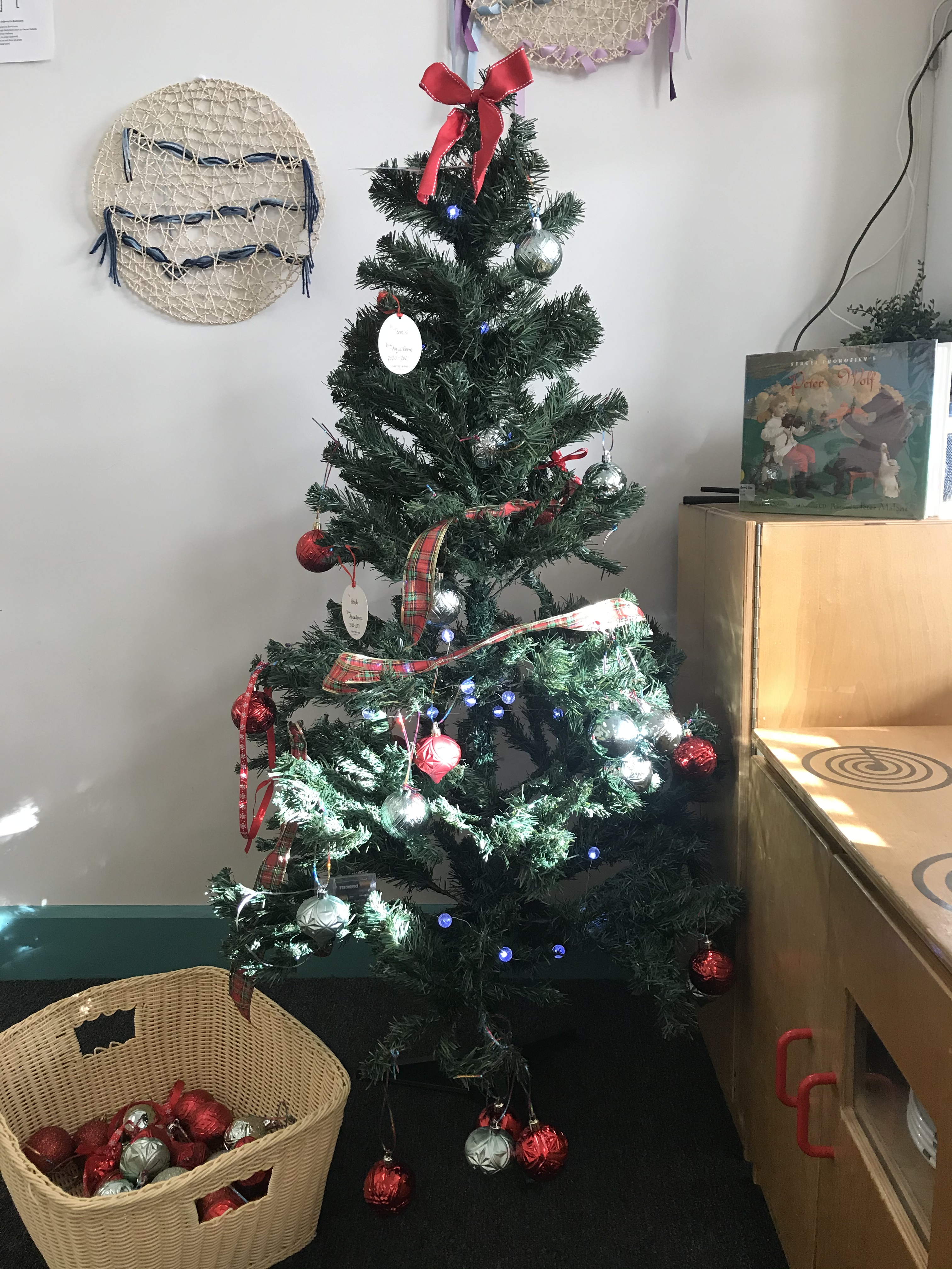 And, we decorated a tree over and over again.  Do you see the book on the shelf?  “Peter and the Wolf.”  It is the best introduction to music and instruments.  We listened to the CD, and worked hard to hear the violin, the clarinet, the oboe, French horn, and more.