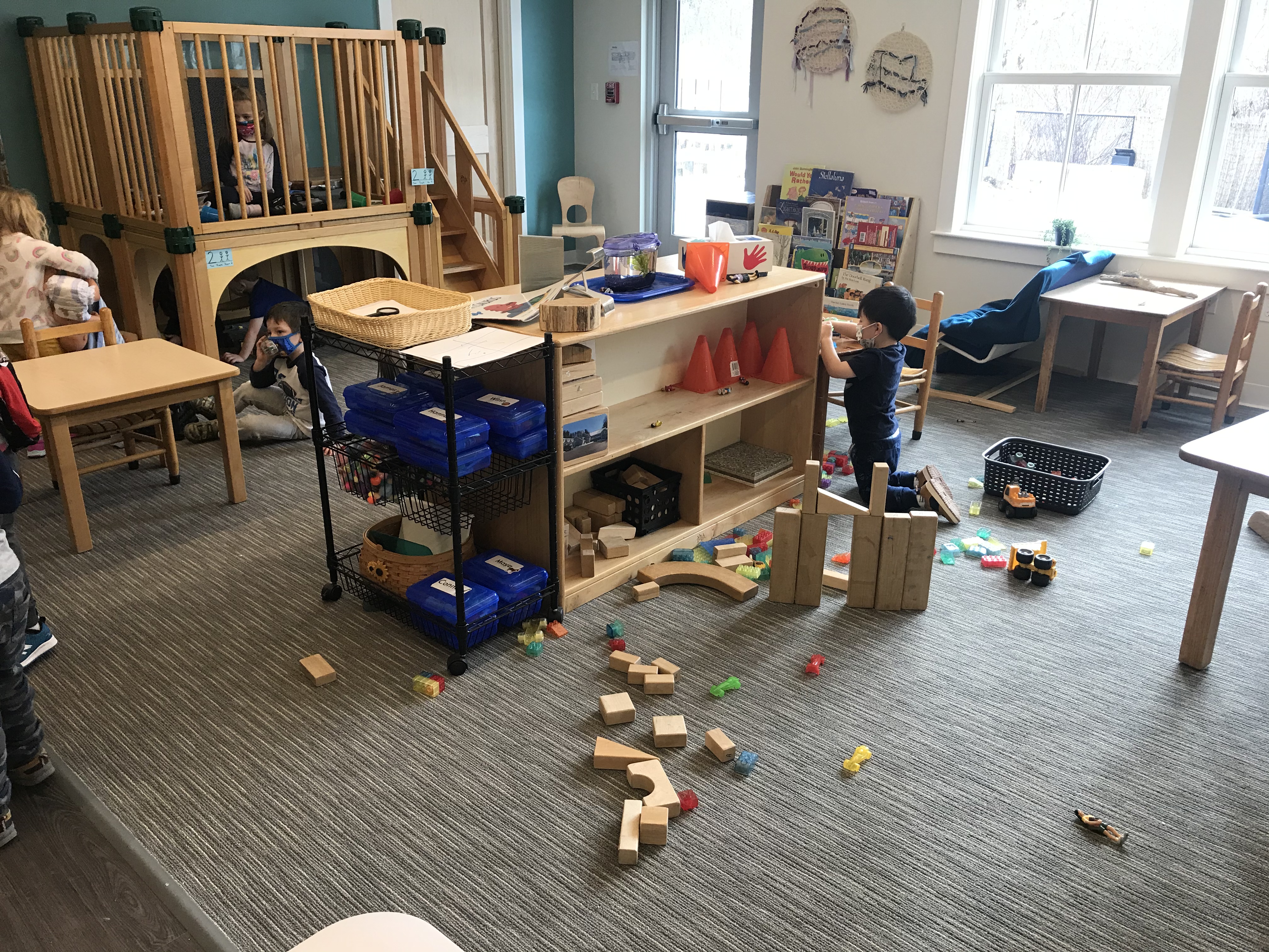 The loft is a big hit.  Don’t you wish you’d had a loft to play in when you were a child?  Think of a fort, or blankets over furniture.  Lofts are an intimate space where play can be focused, even quiet in the midst of a busy classroom.  Reading a book, taking care of dolls, building, or just ‘being’ is what children need, every day.  The balance of quiet and active is a must.