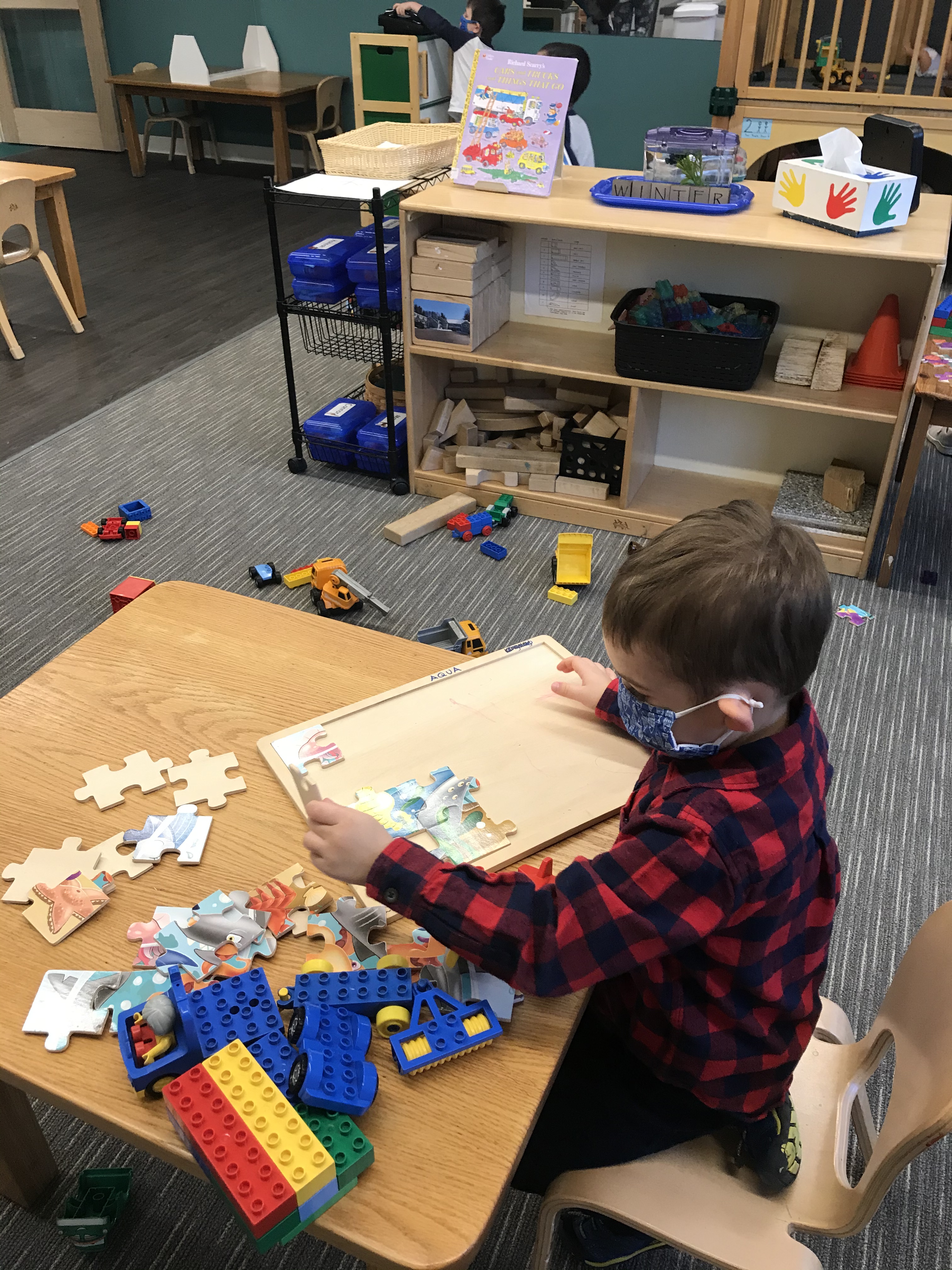 We actually settled down for group activities.  Morning meeting was in a new place in a different classroom.  Connor, once again, grabbed his favorite book from the shelf, “This Land is Your Land”, and shoved it in my hands.  He loves the song- well, we all do.