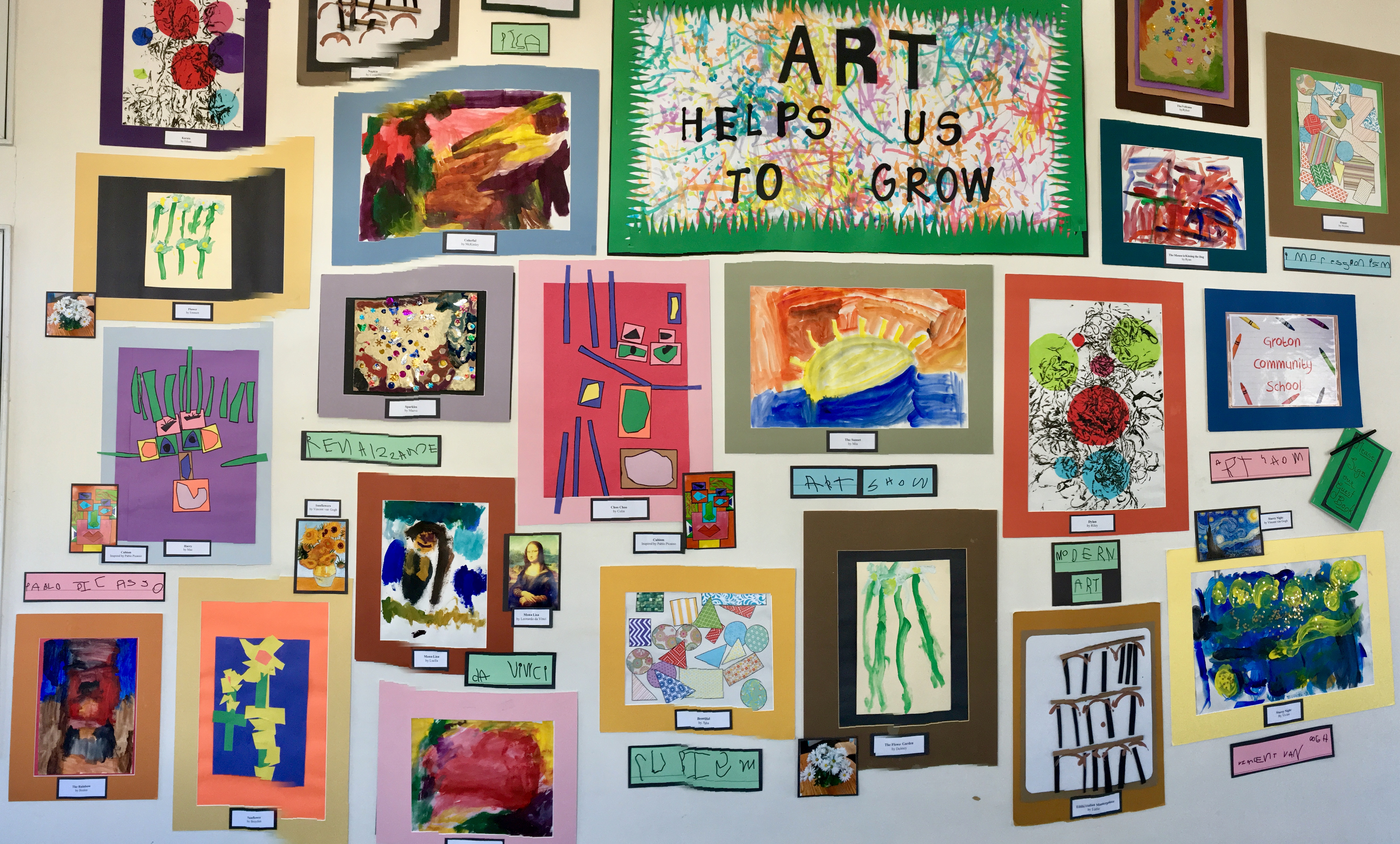 Fast forward to my life as a preschool teacher in New England.  I am drawn to museums.  I introduce children to art – real art – and inspire them to create their own ‘masterpiece’ and display their work for the whole community to see.  We have just begun preparing for this year’s show, starting with Grandma Moses.  We will recreate Early Renaissance art, Venice, sunflowers, and more.  Here are a few photos of our past Art Shows (they always hang at our post office):