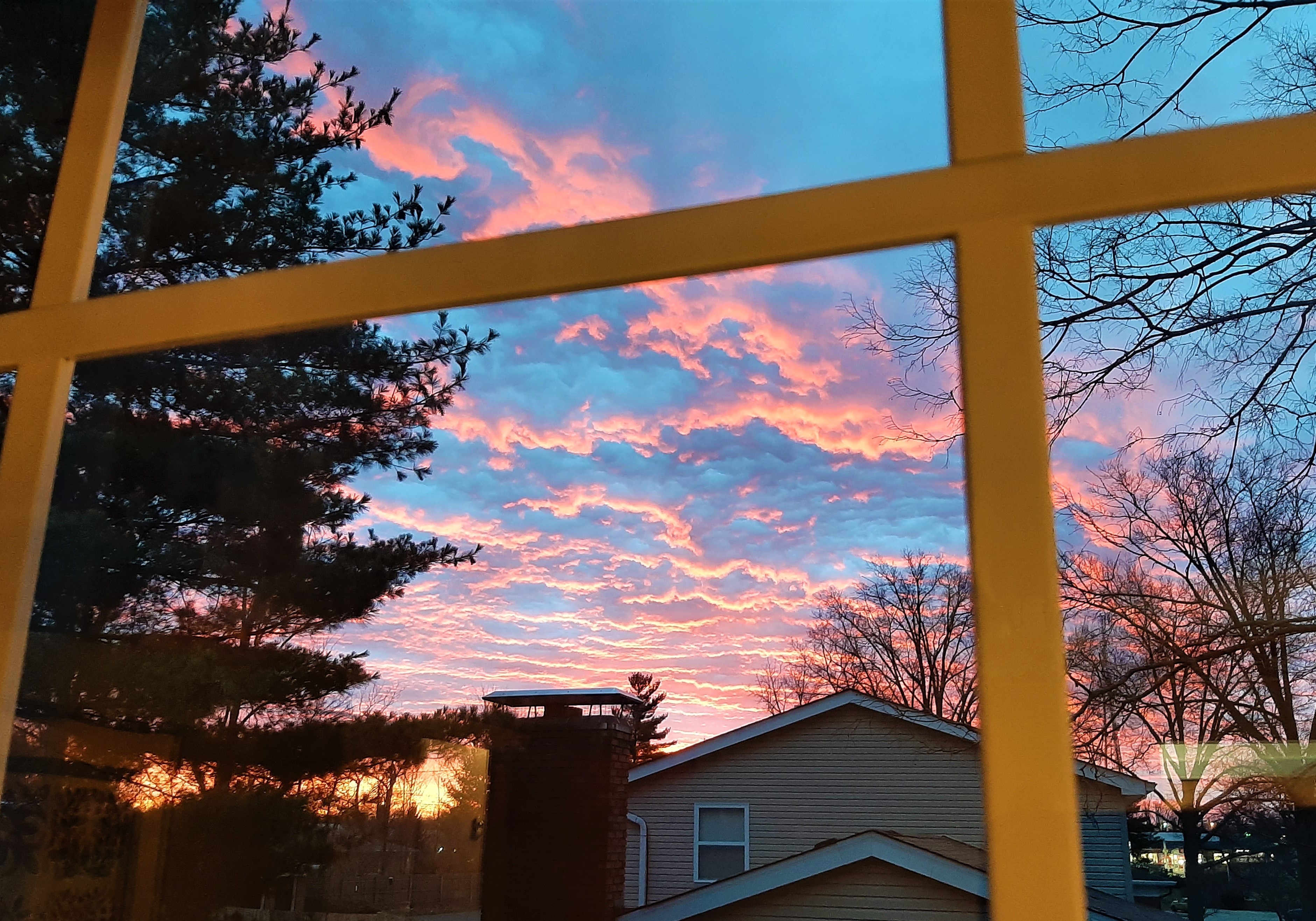 Early spring sunrise from our bedroom window – photo by Mitch Teemley