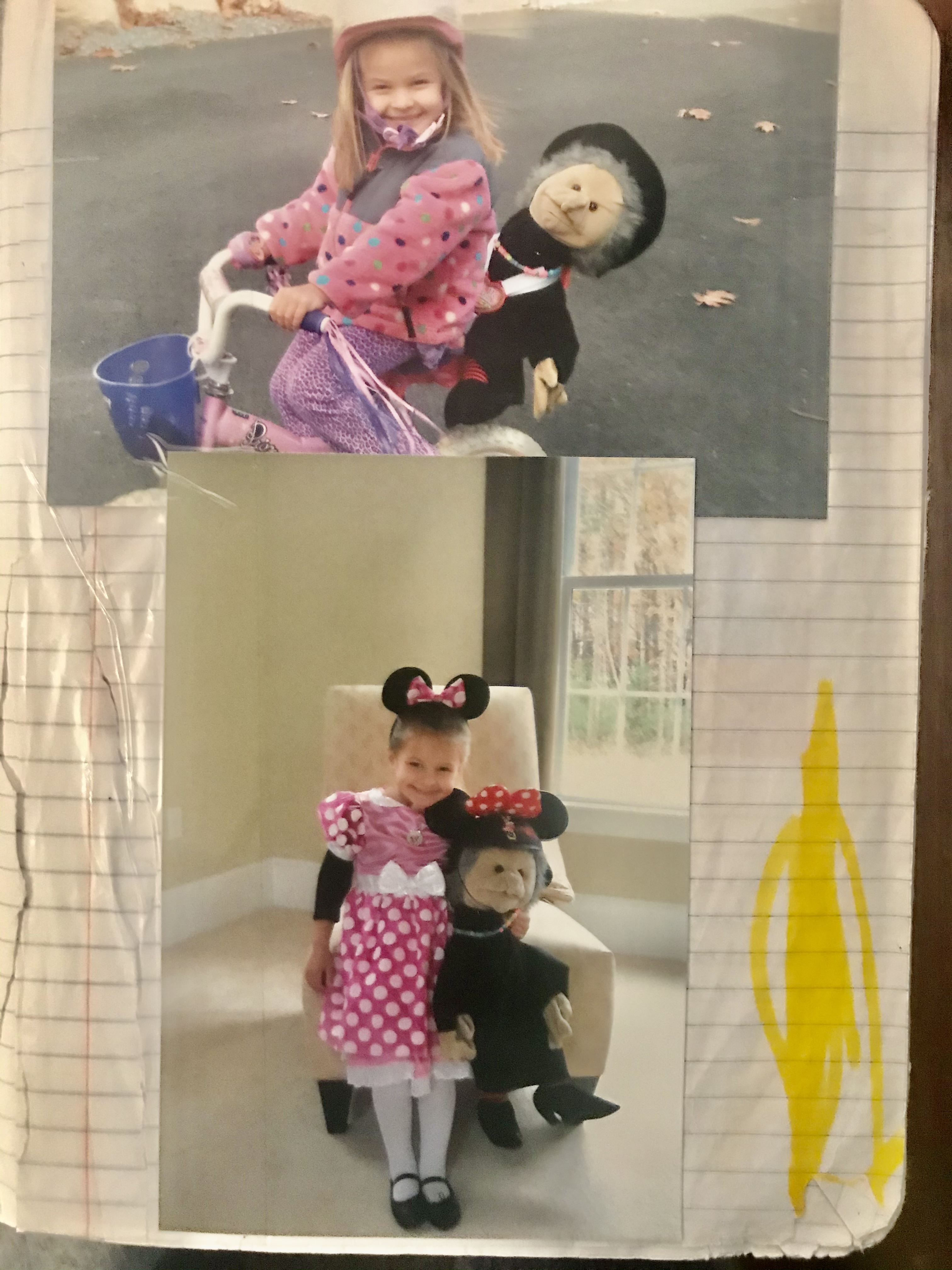 Therefore, I started a Gloria journal.  Now, she was living on the couch, and was spending some weekends with children.  The journal was instrumental in recording Gloria’s adventures and making a bigger connection with both children and families.  If there was a fire in the school and I could only grab one artifact, it would be Gloria and her journal.  That year Erin took Gloria Trick-or-Treating.  Really.  Gloria was Minnie Mouse.  Her parents were a little annoyed that other neighborhood families Trick-or-Treating did not ‘get it’.