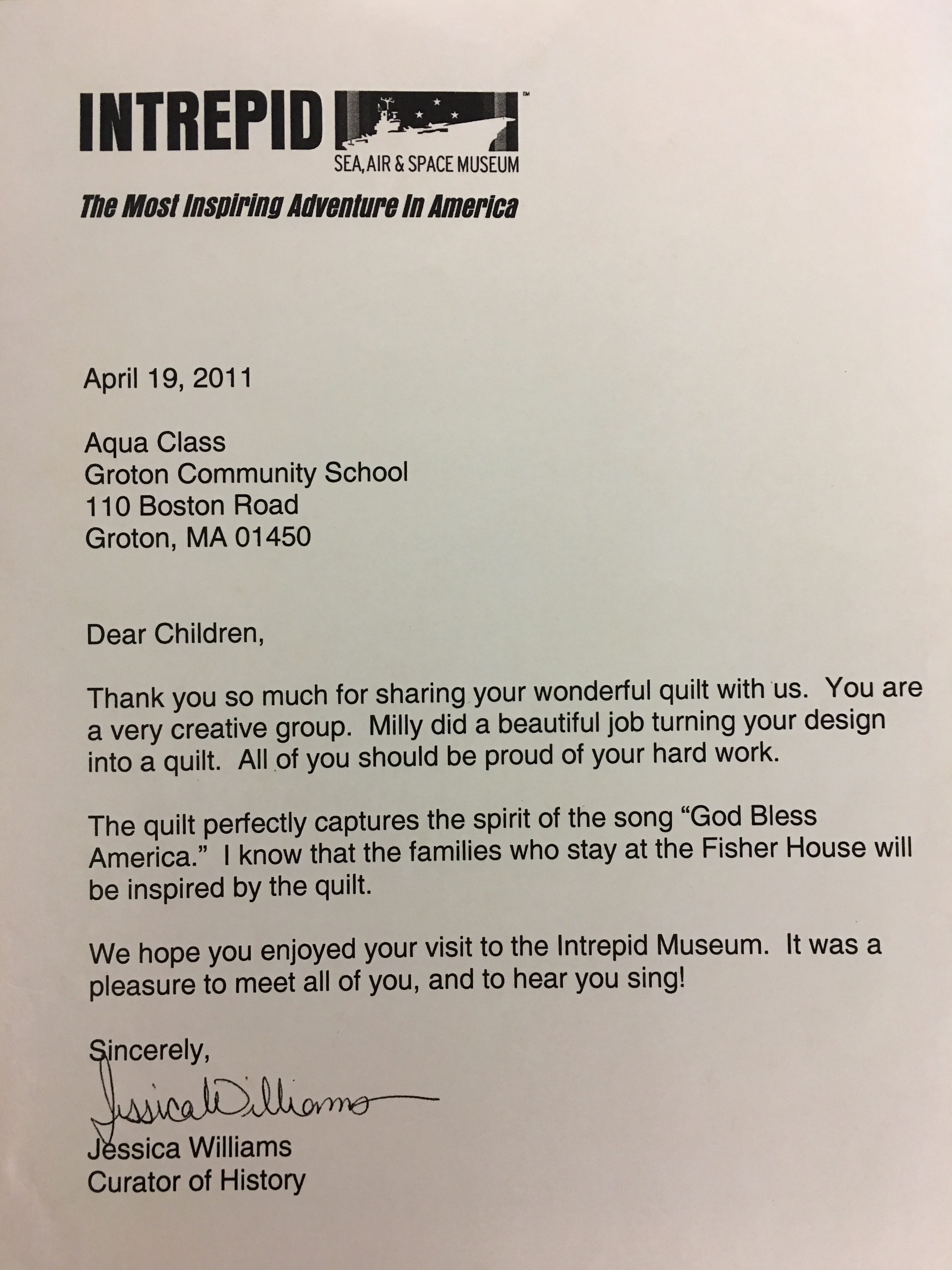 In Part 5, the children were over the moon singing “God Bless America” at every opportunity. We sang for soldiers, and made our own God Bless America book for families, writing and illustrating all the words to the song. Children still wanted more- I could tell. Milly to the rescue to make a God Bless America quilt. The Intrepid Museum in NYC was interested in the quilt!